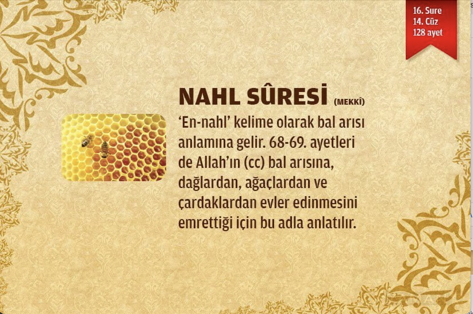 Mekke döneminde inmiştir. 128 âyettir. Sûre, adını 68. âyette geçen “en-Nahl” kelimesinden almıştır. “en-Nahl” bal arısı demektir. Sûrede başlıca, kâinatta Allah’ın varlığını ve birliğini gösteren deliller, vahiy, öldükten sonra dirilme gibi konular yer almaktadır