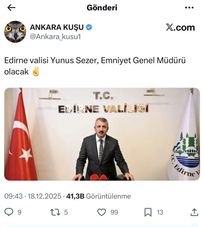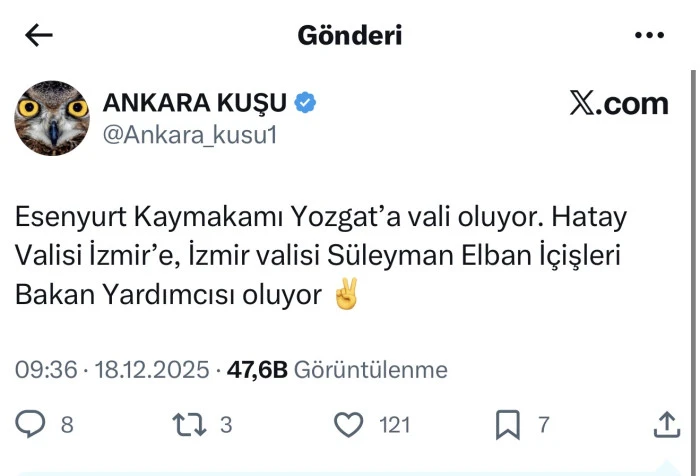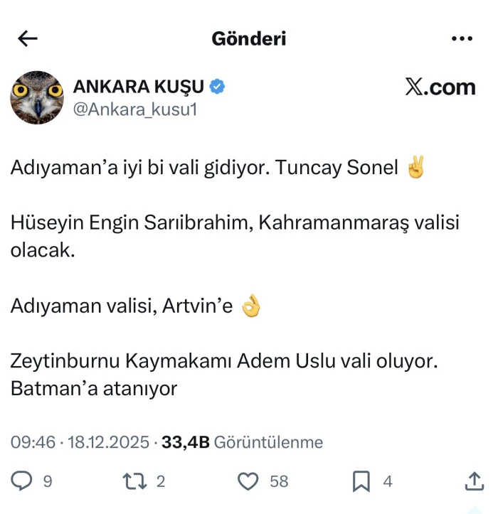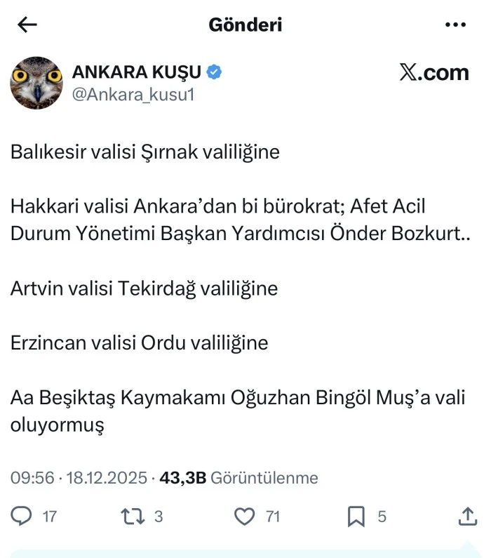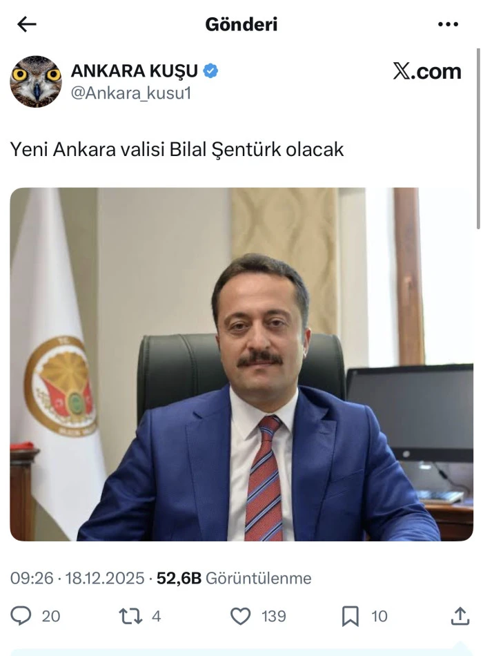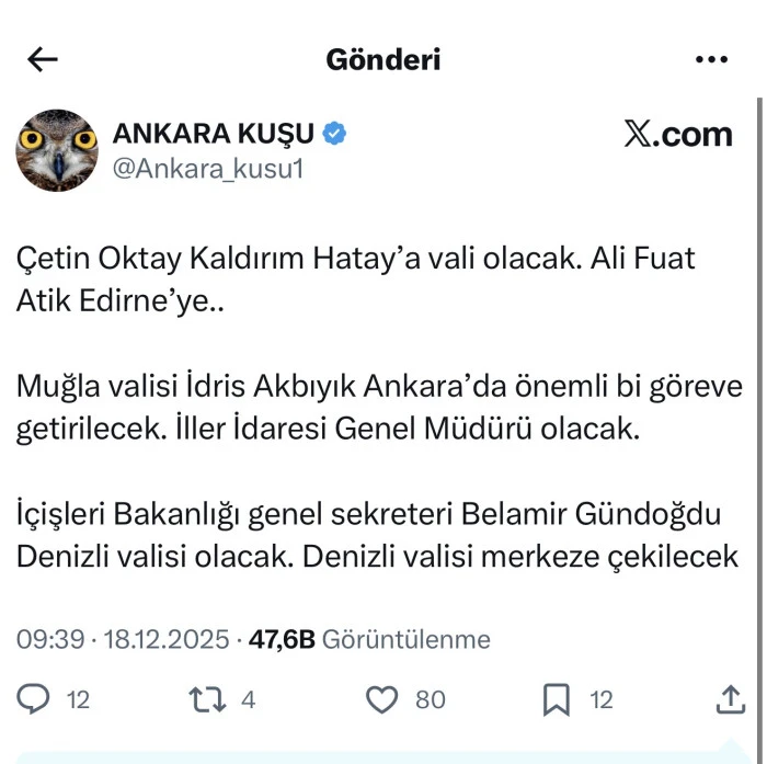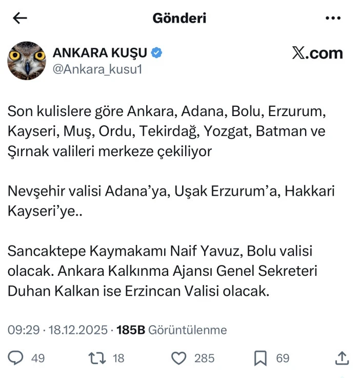 SonDakika: NetHaberler.Com’un edindiği bilgiye göre; Ankara kuşu rumuzlu X hesabı, bugün paylaştığı bir dizi mesajla gündemi salladı. Hesap, aralarında Muğla, Balıkesir, Hakkari gibi kritik illerin de bulunduğu birçok valinin yer değiştireceğini iddia etti. Bu iddialar, resmi açıklamadan önce sızan taslaklara dayanıyor gibi görünüyor. Hesabın paylaşımları, kısa sürede binlerce etkileşim aldı ve sosyal medyada tartışma yarattı. Özellikle Ankara Valiliği ve İstanbul Valiliği gibi büyükşehirlerdeki olası değişiklikler, siyasi çevreleri tedirgin ediyor.