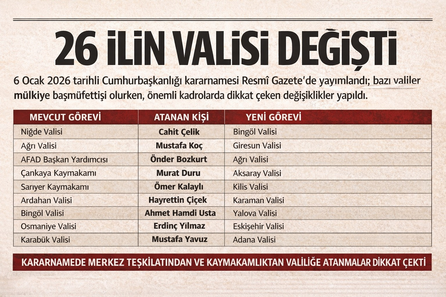 Ayrıca, Murat Duru Aksaray Valisi, Ömer Kalaylı Kilis Valisi, Hüseyin Engin Sarıibrahim Kırıkkale Valisi, Oktay Çağatay Karabük Valisi, Nedim Akmeşe Niğde Valisi, Hüseyin Çakırtaş Çankırı Valisi ve Önder Bozkurt Ağrı Valisi olarak görevlendirildi. Bu listede, Çankaya ve Sarıyer Kaymakamları gibi yerel yönetim kökenli isimlerin valiliğe yükseltilmesi, kararnameyi daha da ilgi çekici kılıyor. 2026 Valiler Kararnamesi ile merkeze çekilen valiler arasında ise Selçuk Aslan, Ercan Turan, Mehmet Ali Kumbuzoğlu, Hülya Kaya, Hüseyin Aksoy, Ömer Faruk Coşkun ve Aziz Yıldırım bulunuyor.