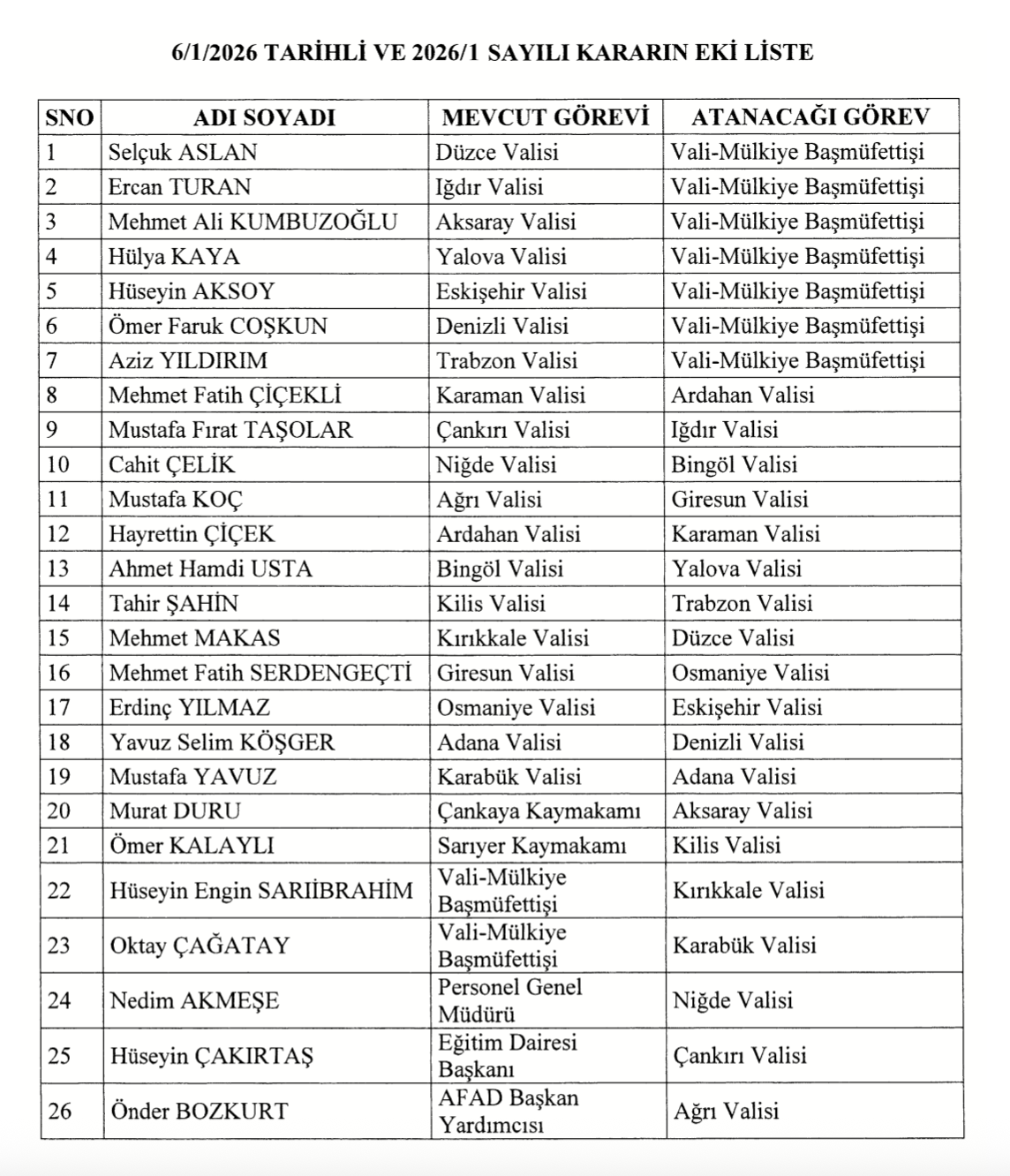 Kararname kapsamında, valiler ataması ile dikkat çeken isimler arasında Mehmet Fatih Çiçekli’nin Ardahan Valisi olarak atanması yer alıyor. Benzer şekilde, Mustafa Fırat Taşolar Iğdır Valisi, Cahit Çelik Bingöl Valisi, Mustafa Koç Giresun Valisi, Hayrettin Çiçek Karaman Valisi, Ahmet Hamdi Usta Yalova Valisi, Tahir Şahin Trabzon Valisi, Mehmet Makas Düzce Valisi, Mehmet Fatih Serdengeçti Osmaniye Valisi, Erdinç Yılmaz Eskişehir Valisi, Yavuz Selim Köşger Denizli Valisi ve Mustafa Yavuz Adana Valisi oldu.