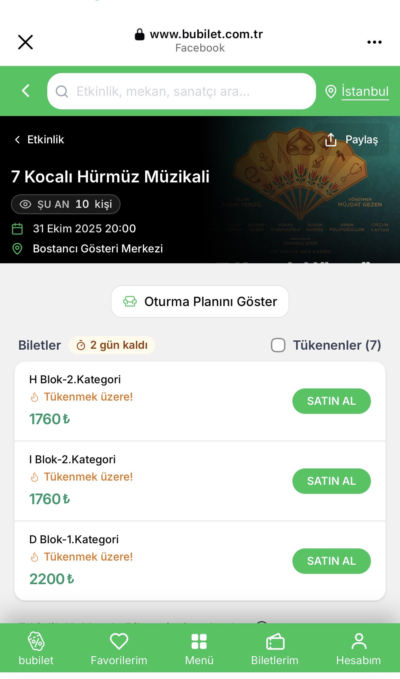 Bilet heyecanı dorukta! Bubilet.com.tr’de Bostancı Gösteri Merkezi seansı için fiyatlar 150 TL’den başlıyor – ama stoklar eriyor, erken davranın! Turne devamı: 28 Ekim 2025 Lütfi Kırdar, 22 Kasım 2025 Bursa Merinos AKM, 23 Kasım 2025 İstanbul Lütfi Kırdar. Biletinial ve tiyatrolar.com.tr de alternatifler sunuyor.