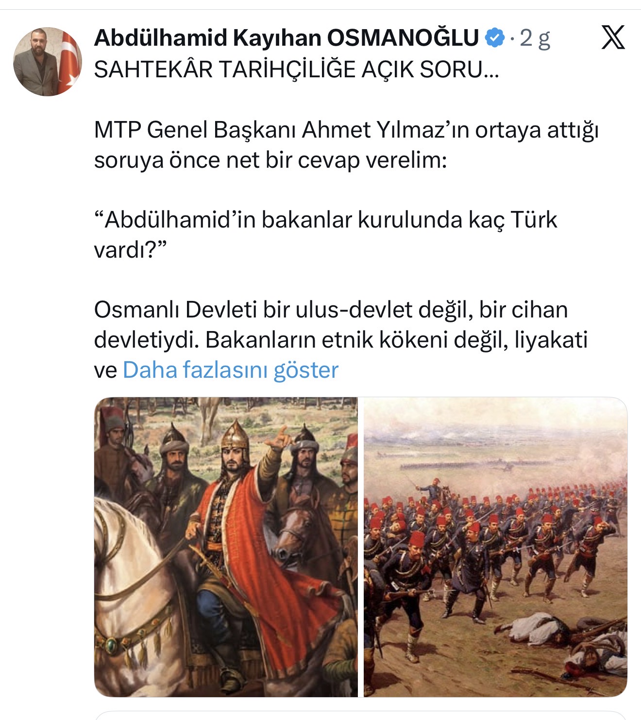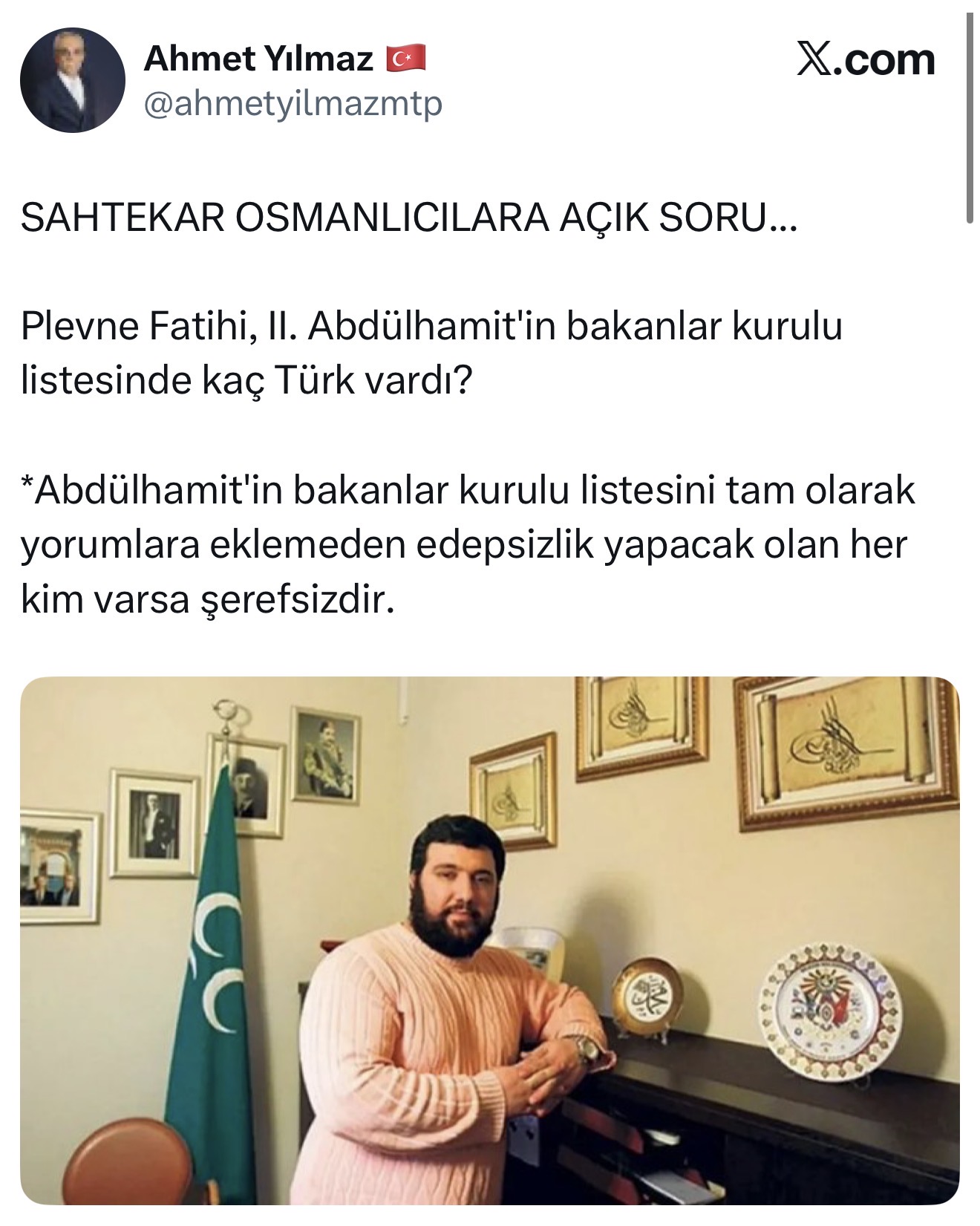 Milliyetçi Türkiye Partisi Genel Başkanı Ahmet Yılmaz, sosyal medya hesabından yaptığı bir paylaşımda dikkat çekti. Paylaşımında Abdülhamid Osmanoğlu'nu etiketleyen Yılmaz, dedesi Sultan Abdülhamid Han üzerinden bir tartışma başlatmayı amaçladı. "Bakanlar Kurulu’nda kaç tane Türk vardı?" şeklindeki sorusuyla tarihi bir mesele üzerinden manipülasyon ve demagoji yaparak durumu aydınlatmak istediğini ima etti.