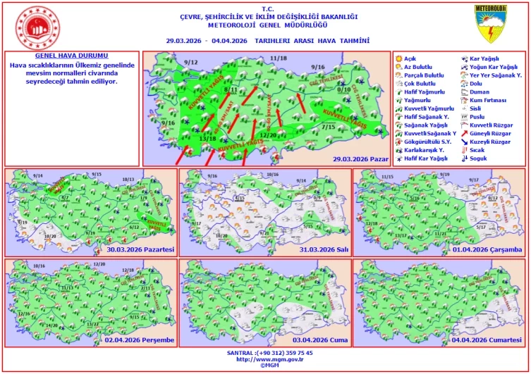 Meteoroloji Genel Müdürlüğü (MGM) tarafından 30 Mart - 5 Nisan 2026 tarihlerini kapsayan hava tahmin raporuna göre, ülke genelinde yağışlı bir hafta bekleniyor. Özellikle Doğu Anadolu için çığ, kıyı kesimler için ise kuvvetli yağış uyarısı yapıldı.