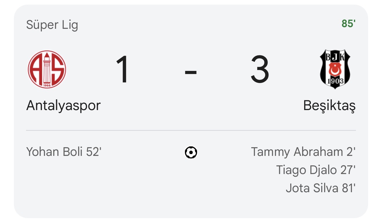 SonDakika: NetHaberler’in edindiği bilgiye göre; Trendyol Süper Lig’in 12. haftasında (Week 12) Corendon Airlines Park’ta oynanan dev kapışma, Beşiktaş’ın (Beşiktaş) üstünlüğüyle sona erdi. Siyah-beyazlılar, erken golle başladığı mücadelede Abraham, Djalo ve Jota Silva’nın (Jota Silva) şovlarıyla rakibini 1-3 yendi. Antalyaspor’un tek isabeti Boli’den geldi. Bu galibiyet, Beşiktaş’ı puan tablosunda yukarı taşıdı – peki ya sen, bu skoru bekliyor muydun? Yorumlarda fikirlerini paylaş, heyecanı birlikte yaşayalım!