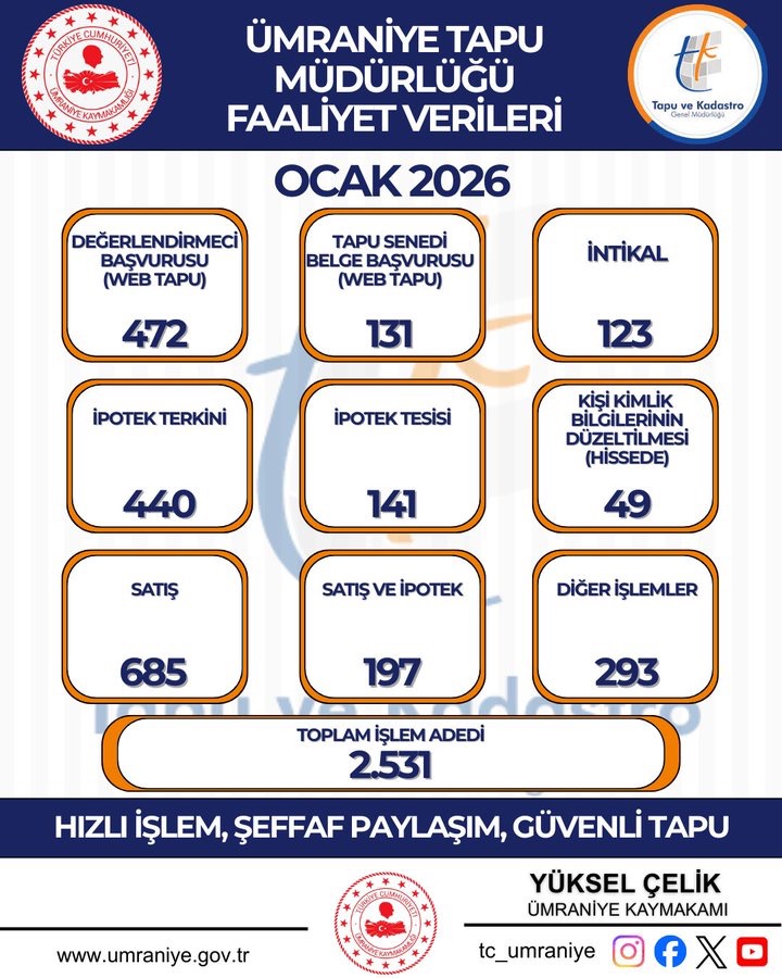Ümraniye Tapu Müdürlüğü Ocak 2026 Faaliyet Verileri: Toplam 2.531 İşlem Tamamlandı! Satış ve Web Tapu Başvuruları Zirvede