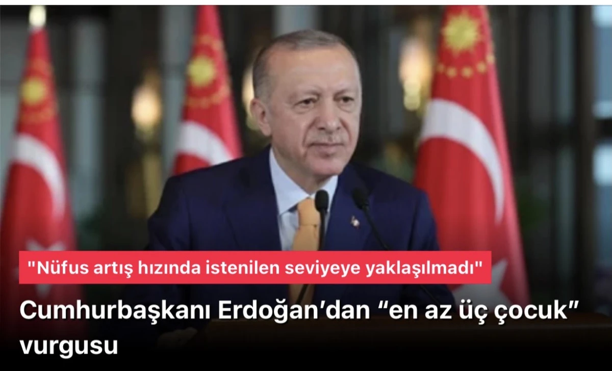 Cumhurbaşkanı Recep Tayyip Erdoğan, nüfus artış hızında hala bir netice alınamadığını belirterek, "Gelişmeler iyi değil, en az 3 çocuk güçlü bir ailenin olmazsa olmazı, neslimiz çoğalmalı" dedi.