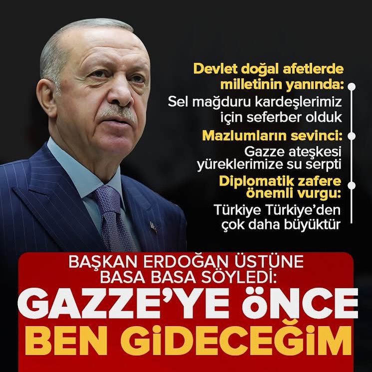 Cumhurbaşkanı Erdoğan, Rize’deki AK Parti Genişletilmiş İl Danışma Meclisi Toplantısı’nda, Gazze’deki ateşkes anlaşmasını değerlendirdi. “Gazze’de yüreklerimize su serpildi,” diyerek ateşkesin önemine dikkat çeken Erdoğan, Türkiye’nin bu süreçteki diplomatik çabalarını vurguladı. Gazze’ye yapacağı ziyareti duyuran Erdoğan, “Gazze’ye önce ben gideceğim, sonra siz,” diyerek Filistin halkıyla dayanışma mesajı verdi.