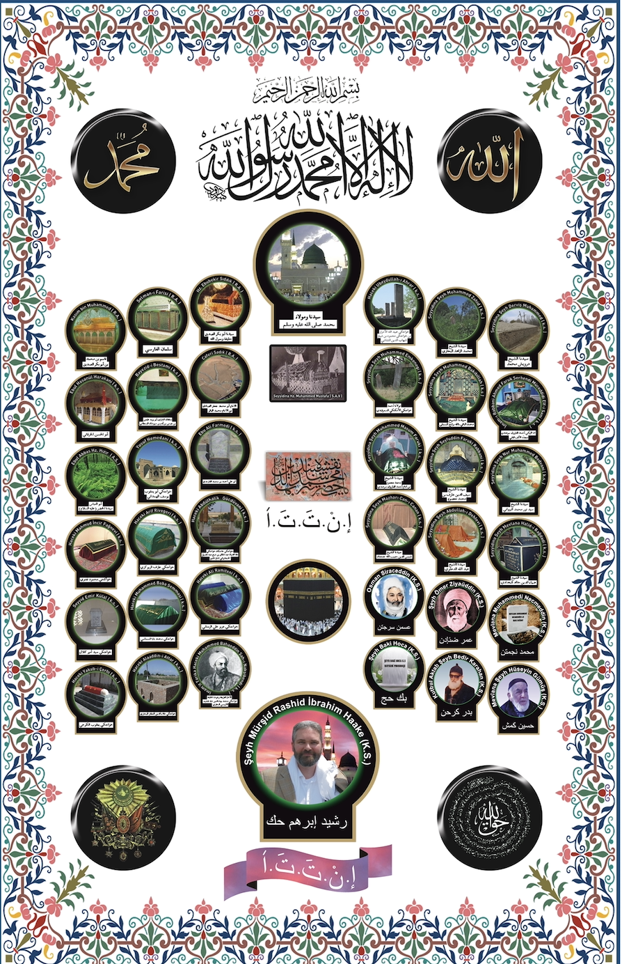 1 – Hazret-i Muhammed Mustafâ (sallâllâhu aleyhi ve sellem) 2 – Hazret-i Ebû Bekir Sıddîk (radıyallâhu anh) 3 – Selmân-ı Fârisî (radıyallâhu anh) 4 – Kâsım Bin Muhammed (rahmetullâhi aleyh) 5 – Câfer-i Sâdık (rahmetullâhi aleyh) 6 – Bâyezîd-i Bistâmî (rahmetullâhi aleyh) 7 – Ebû’l-Hasan Harakānî (rahmetullâhi aleyh) 8 – Ebû Ali Fârmedî (rahmetullâhi aleyh) 9 – Yûsuf Hemedânî (rahmetullâhi aleyh) 10 – Ebu-l Abbas Hz. Hızır (aleyihisselam) 11– Abdülhâlık Gucdüvânî (rahmetullâhi aleyh) 12 – Muhammed Ârif Rîvgerî (rahmetullâhi aleyh) 13 – Mahmûd Encîrfağnevî (rahmetullâhi aleyh) 14 – Ali Râmîtenî (rahmetullâhi aleyh) 15 – Muhammed Baba Semmâsî (rahmetullâhi aleyh) 16 – Seyyid Emîr Külâl (rahmetullâhi aleyh) 17 – Bahâüddîn Şâh-ı Nakşibend (rahmetullâhi aleyh) 18 – Alâüddîn Attâr (rahmetullâhi aleyh) 19 – Yâkub-el Çerhî (rahmetullâhi aleyh) 20 – Ubeydullah-el Ahrâr (rahmetullâhi aleyh) 21 – Muhammed Ez-Zâhid (rahmetullâhi aleyh) 22 – Derviş Muhammed İmkenegî (rahmetullâhi aleyh) 23 – Hâcegî Muhammed Semerkandi (rahmetullâhi aleyh) 24 – Muhammed El-Bâkī Billâh (rahmetullâhi aleyh) 25 – İmâm-ı Rabbânî Ahmed Fârûkî Serhendî (rahmetullâhi aleyh) 26 – Muhammed Mâsûm Serhendî (rahmetullâhi aleyh) 27 – Muhammed Seyfüddîn Serhendî (rahmetullâhi aleyh) 28 – Seyyid Nûr Muhammed Bedâyûnî (rahmetullâhi aleyh) 29 – Mirzâ Mazhar Cân-ı Cânân (rahmetullâhi aleyh) 30 – Abdullah Dehlevî (rahmetullâhi aleyh) 31 – Mevlânâ Hâlid-i Bağdâdî (rahmetullâhi aleyh) 32 – Mevlânâ Osman Siraceddin (rahmetullâhi aleyh) 33 – Mevlânâ Şeyh Ömer Ziyaüddin (rahmetullâhi aleyh) 34 – Mevlânâ Muhammed Necmeddin-i Kübra (rahmetullâhi aleyh) 35 – Şeyh Baki Hocaefendi (rahmetullâhi aleyh) 36 – Kutb-ul Aktab Şeyh Bedir Karahan (rahmetullâhi aleyh) 37 – Mevlânâ Şeyh Mürşid Hüseyin Gümüş (rahmetullâhi aleyh) 38 – Şeyh Mürşid Rashid İbrahim Haake (rahmetullâhi aleyh).