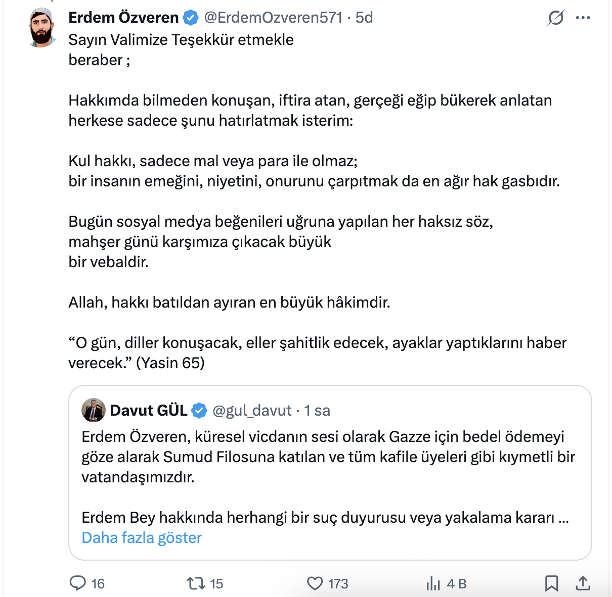 Sumud Filosunda bulunduğu sırada gözaltına alındığı iddia edilen Erdem Özveren, hakkında yapılan valilik açıklamasına ilişkin bir paylaşımda bulunarak bu iddiaları yalanlamıştı. Bunun ardından Vali Davut Gül ile vekil Hasan Turan'ın Özveren'i aradığı öğrenildi.