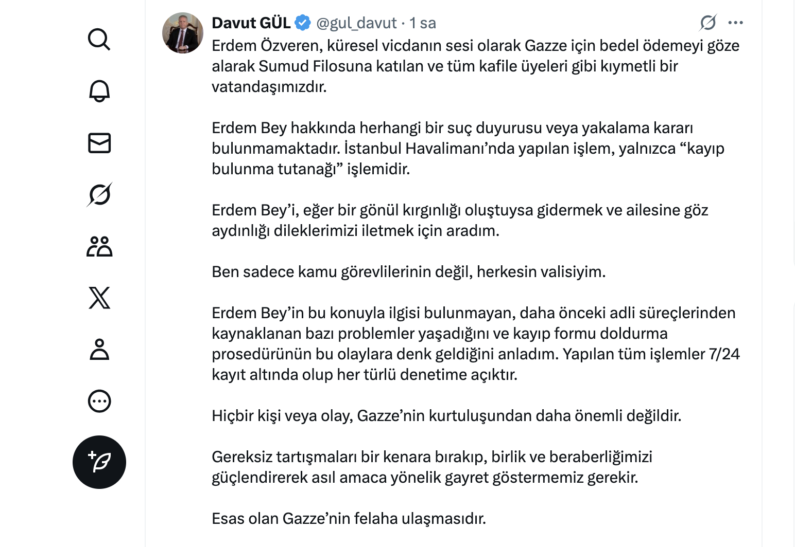 Erdem Özveren, küresel vicdanın sesi olarak Gazze için bedel ödemeyi göze alarak Sumud Filosuna katılan ve tüm kafile üyeleri gibi kıymetli bir vatandaşımızdır. Erdem Bey hakkında herhangi bir suç duyurusu veya yakalama kararı bulunmamaktadır. İstanbul Havalimanı’nda yapılan işlem, yalnızca “kayıp bulunma tutanağı” işlemidir. Erdem Bey’i, eğer bir gönül kırgınlığı oluştuysa gidermek ve ailesine göz aydınlığı dileklerimizi iletmek için aradım. Ben sadece kamu görevlilerinin değil, herkesin valisiyim. Erdem Bey’in bu konuyla ilgisi bulunmayan, daha önceki adli süreçlerinden kaynaklanan bazı problemler yaşadığını ve kayıp formu doldurma prosedürünün bu olaylara denk geldiğini anladım. Yapılan tüm işlemler 7/24 kayıt altında olup her türlü denetime açıktır. Hiçbir kişi veya olay, Gazze’nin kurtuluşundan daha önemli değildir. Gereksiz tartışmaları bir kenara bırakıp, birlik ve beraberliğimizi güçlendirerek asıl amaca yönelik gayret göstermemiz gerekir. Esas olan Gazze’nin felaha ulaşmasıdır.
