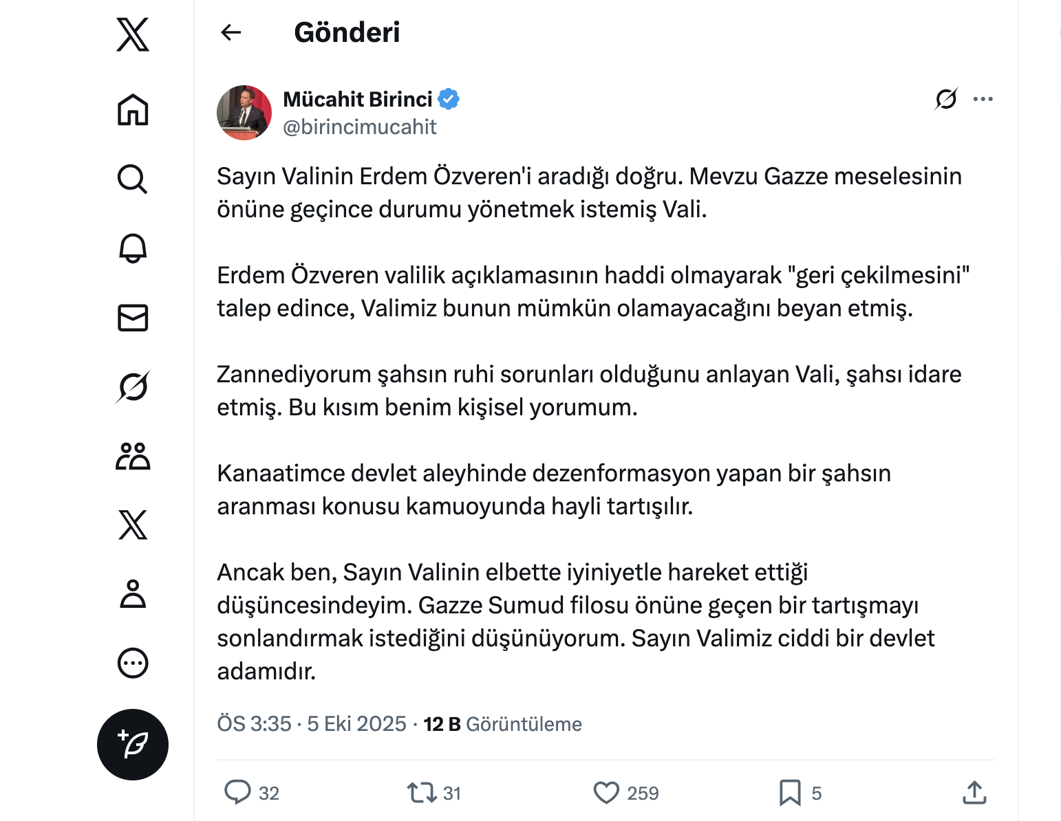 Sayın Valinin Erdem Özveren'i aradığı doğru. Mevzu Gazze meselesinin önüne geçince durumu yönetmek istemiş Vali. Erdem Özveren valilik açıklamasının haddi olmayarak "geri çekilmesini" talep edince, Valimiz bunun mümkün olamayacağını beyan etmiş. Zannediyorum şahsın ruhi sorunları olduğunu anlayan Vali, şahsı idare etmiş. Bu kısım benim kişisel yorumum. Kanaatimce devlet aleyhinde dezenformasyon yapan bir şahsın aranması konusu kamuoyunda hayli tartışılır. Ancak ben, Sayın Valinin elbette iyiniyetle hareket ettiği düşüncesindeyim. Gazze Sumud filosu önüne geçen bir tartışmayı sonlandırmak istediğini düşünüyorum. Sayın Valimiz ciddi bir devlet adamıdır.