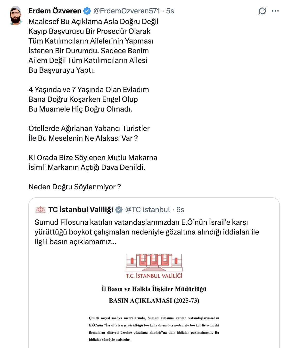 İstanbul Valiliği'nin Sumud Filosu dönüşündeki Erdem Özveren iddialarına yanıtını alıntılayan Özveren'in "Maalesef bu açıklama asla doğru değil" paylaşımıyla çakıştı.