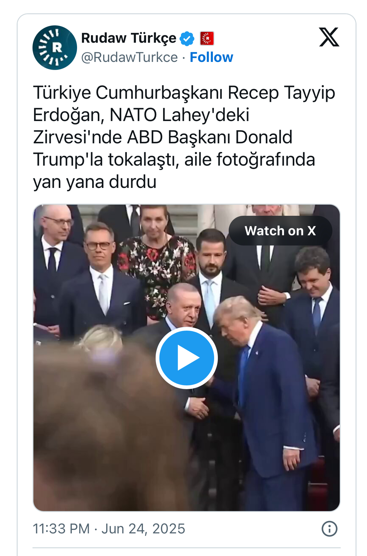 • Cumhurbaşkanı Erdoğan görüşmede, Trump'ın gayretleriyle İsrail-İran arasında sağlanan ateşkesi memnuniyetle karşıladığını belirterek, bunun kalıcı olmasını temenni etti