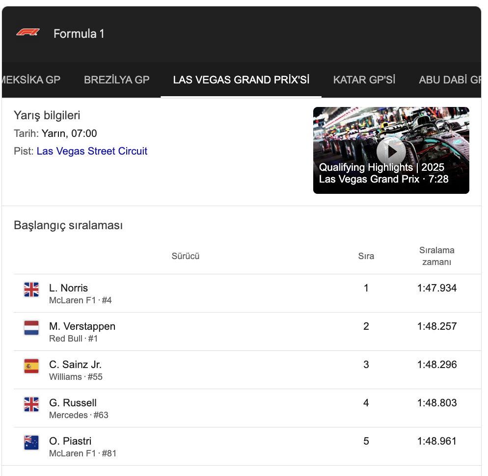 Heyecan dorukta! 2025 F1 sezonu, 24 yarışla rekor kırarken, bugünkü Las Vegas Grand Prix'si ( 22 Kasım ) neon ışıklar altında tamamlandı. Gelecek durak? 28-30 Kasım Katar'da Lusail Pisti – sıcak kumlar ve stratejik sprint'ler sizi bekliyor. Sezon, 16 Mart'ta Avustralya'yla start aldı; Lando Norris'in Melbourne zaferi, McLaren'ı zirveye taşıdı. Çin'deki ilk Sprint (22 Mart), Oscar Piastri'nin şovuna sahne oldu. Katar'da ne olacak? Verstappen mi yoksa Hamilton mı? Tahminlerinizi bekliyoruz – bu yarış, şampiyonluğu şekillendirebilir!