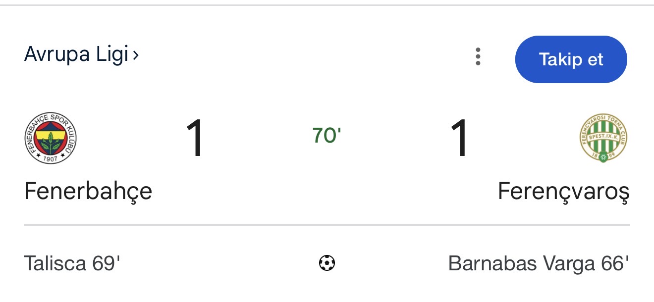 SonDakika: NetHaberler’in edindiği bilgiye göre; Sarı-Lacivertliler, TALISCA’nın 69. dakikada attığı muhteşem golle skoru eşitledi ve derbi öncesi moral depoladı. Peki, bu heyecan dolu maçta neler yaşandı? Fenerbahçe 1-1 Ferencvaros maç sonucu (Fenerbahçe 1 Ferencvaros 1 match ended) detayları haberimizde!