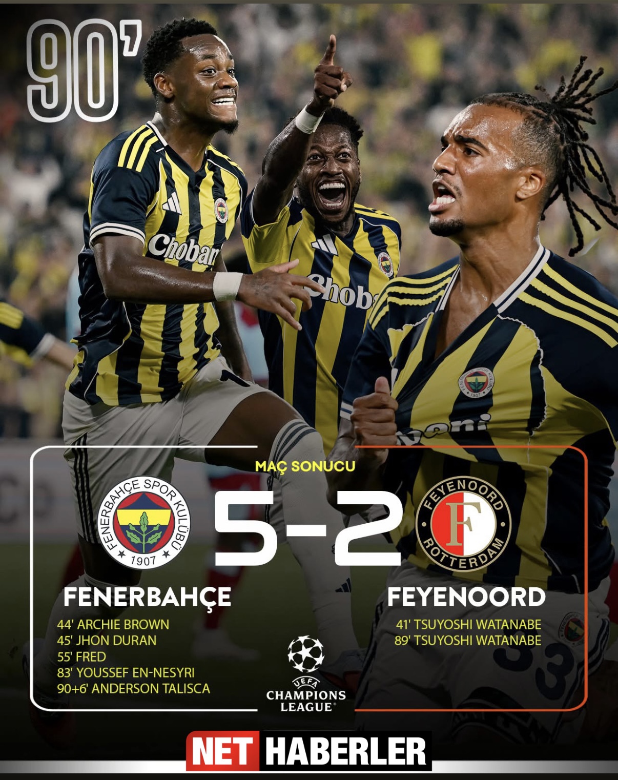 UEFA Şampiyonlar Ligi 3. turunda Fenerbahçe ilk maçı 2-1 kaybettiği turun rövanşında sahasında konuk ettiği Feyenoord'u 5-2 mağlup etti ve adını play-off'a yazdırdı. Sarı-lacivertlilere galibiyeti getiren golleri Archie Brown, Jhon Duran, Fred, Youssef En-Nesyri ve Anderson Talisca kaydetti. Hollanda ekibinin tek golleri ise Tsuyoshi Watanabe'den (2) geldi.