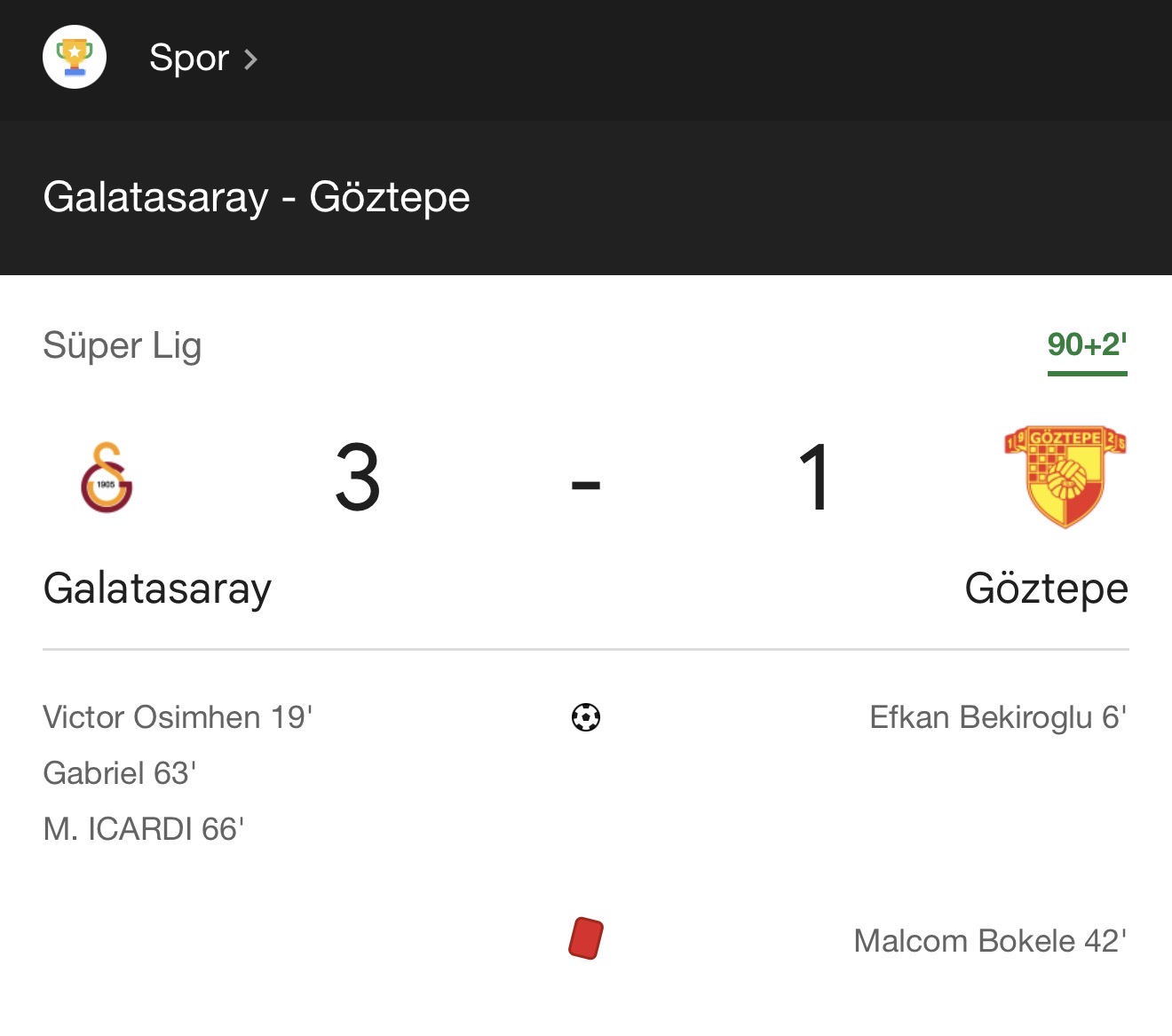 Galatasaray 3 - 1 Göztepe Maç Skoru