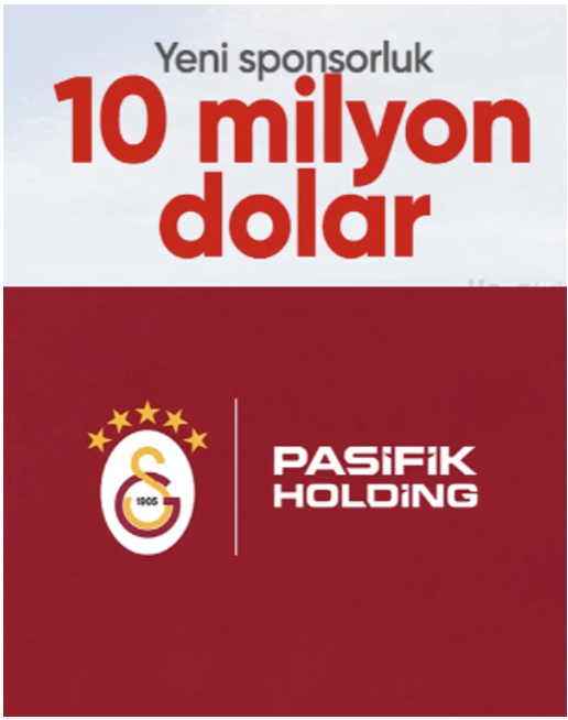 "Pasifik Holding, Futbol A Takımımızın forma göğüs sponsoru oldu. Türk sporunun öncüsü Galatasaray; gayrimenkulden enerjiye, lojistikten teknolojiye birçok alanda yaptığı vizyoner yatırımlar ile ülkemizin önde gelen holdinglerinden Pasifik Holding ile yeni bir sponsorluk anlaşmasına imza atıyor."