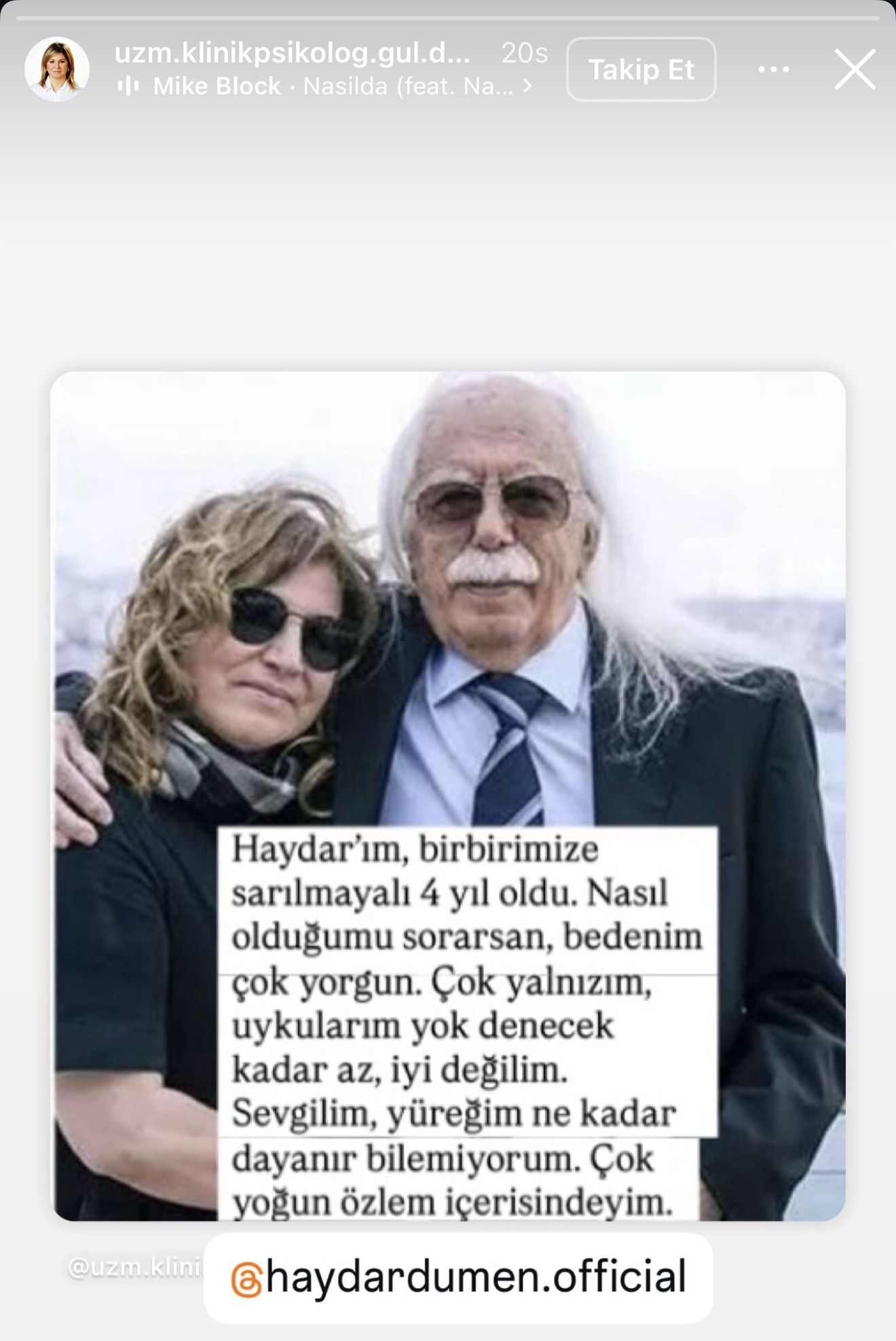 Eşi Uzman Klinik Psikolog Gül Dümen, Instagram hesabından yaptığı paylaşımla yürekleri dağladı. Gül Dümen’in mesajı şöyleydi: