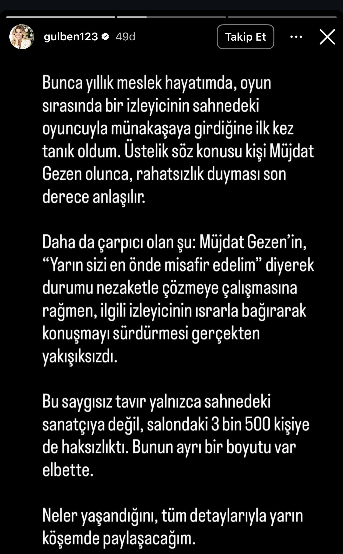 Açıklamasında şunları dile getirdi: Bunca yıllık meslek hayatım boyunca ilk defa oyun sırasında bir izleyicinin sahnedeki bir oyuncu ile tartışmaya girdiğine tanık oldum. Üstelik bu esnada hedef alınan kişi Müjdat Gezen idi ve onun rahatsızlık hissetmesi gayet doğal. Daha da şaşırtıcı olan, Müjdat Gezen'in durumu sakinleştirmek adına "Yarın sizi en önde misafir edelim" şeklindeki nazik yaklaşımına karşın, izleyicinin ısrarla bağırmaya devam etmesiydi. Bu saygısız tutum yalnızca sahnedeki sanatçıyı değil, aynı zamanda salonda bulunan 3 bin 500 kişiyi de fazlasıyla mağdur etti. Bu durumun çok daha geniş boyutları olduğu kanaatindeyim. Tüm ayrıntıları yarın köşe yazımda paylaşacağım.