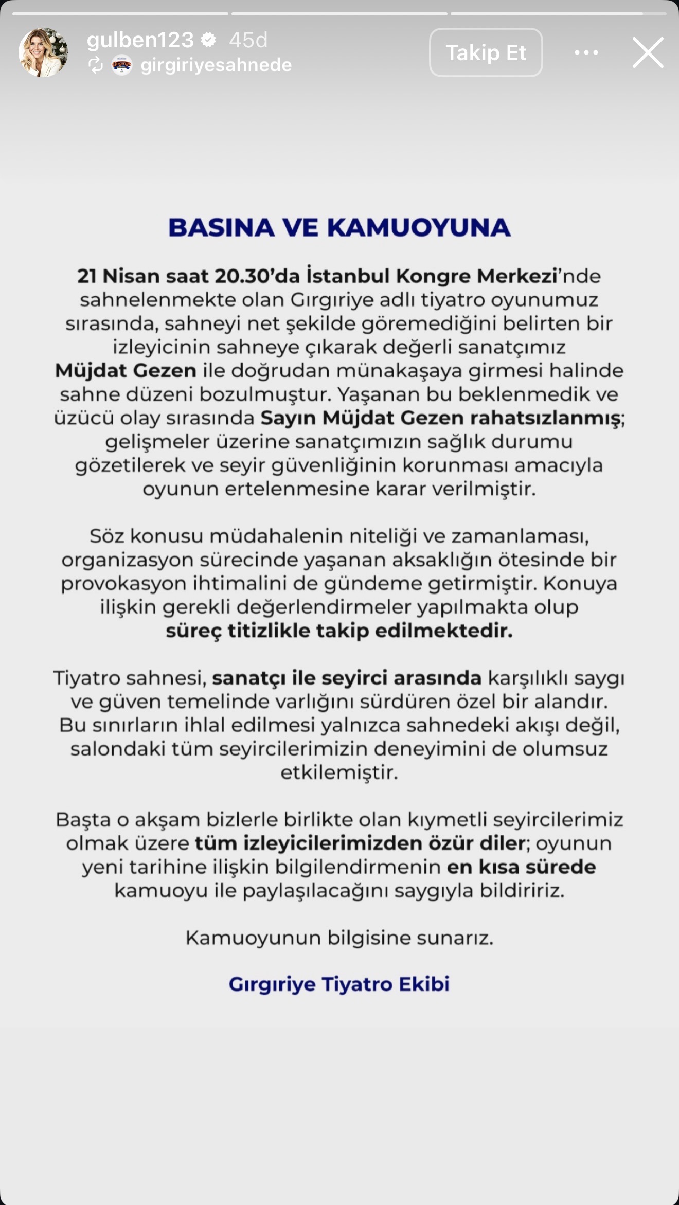 Açıklamada şu ifadelere yer verildi: 21 Nisan saat 20.30’da İstanbul Kongre Merkezi’nde sahnelenen Gırgıriye isimli tiyatro oyunumuz sırasında, seyircilerden biri sahneyi net şekilde göremediğini öne sürerek sahneye çıkıp değerli sanatçımız Müjdat Gezen ile doğrudan tartışmaya girmiştir. Bu hareket, oyun sırasında sahne düzenini ciddi anlamda aksatmıştır. Yaşanan bu beklenmedik ve üzücü olay sırasında, Sayın Müjdat Gezen’in rahatsızlanması üzerine, sanatçımızın sağlık durumunu gözetmek ve seyir düzenini sağlamak adına oyunun ertelenmesine karar verilmiştir. Olayın zamanlaması ve niteliği, provokasyon ihtimalini gündeme getirmekte olup konu kapsamlı şekilde değerlendirilmektedir. Sürecin dikkatle takip edildiğini belirtmek isteriz. Tiyatro sahnesi, sanatçı ile izleyici arasında karşılıklı saygı ve güven temelinde varlığını sürdüren özel bir alandır. Bu sınırların ihlal edilmesi sadece sahnedeki akışı değil, aynı zamanda salondaki izleyicilerin deneyimini de olumsuz yönde etkilemektedir. O gece oyunumuzu izlemeye gelen değerli seyircilerimiz başta olmak üzere tüm izleyicilerimizden özür diliyoruz. Oyunumuzun yeni tarihi en kısa sürede açıklanacak ve kamuoyu bilgilendirilecektir.