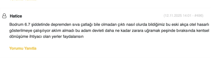Otelin 10 yıllık kentsel dönüşüm geçmişi, şimdi yargı önünde. İhbarlar, yenileme sürecinde muafiyet avcılığını işaret ediyor. Ekşi Sözlük kullanıcıları, “Ömer Aybak’ın Bodrum yatırımı depremde risk mi?” diye tartışıyor. Bu, sadece bir otel değil; tüm sahil şeridinin kaderini belirleyebilir.