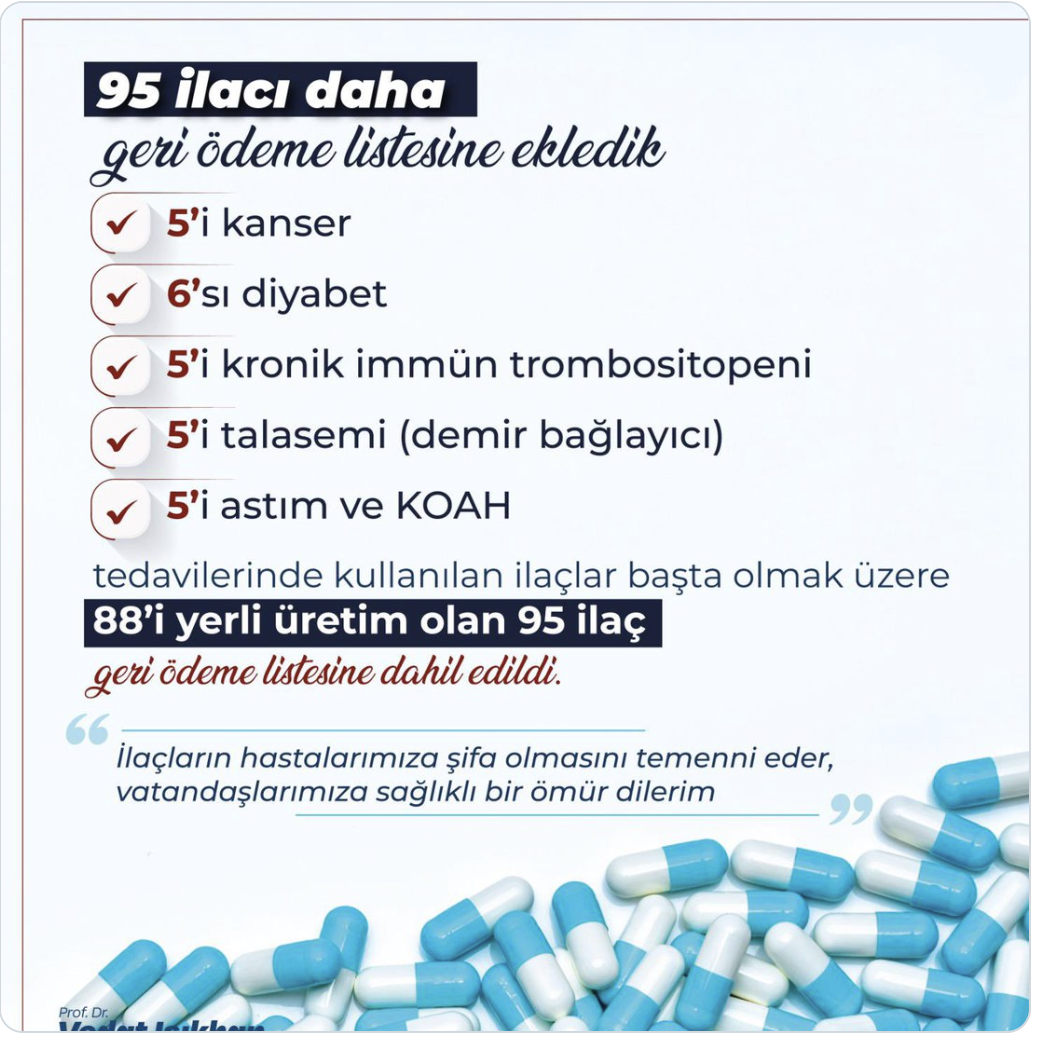 Çalışma Bakanı Vedat Işıkhan yaptığı açıklamada "Sosyal Güvenlik Kurumumuzun düzenlemesi kapsamında 88'i yerli üretim olmak üzere 95 ilacı daha geri ödeme listesine aldık." ifadelerini kullandı.