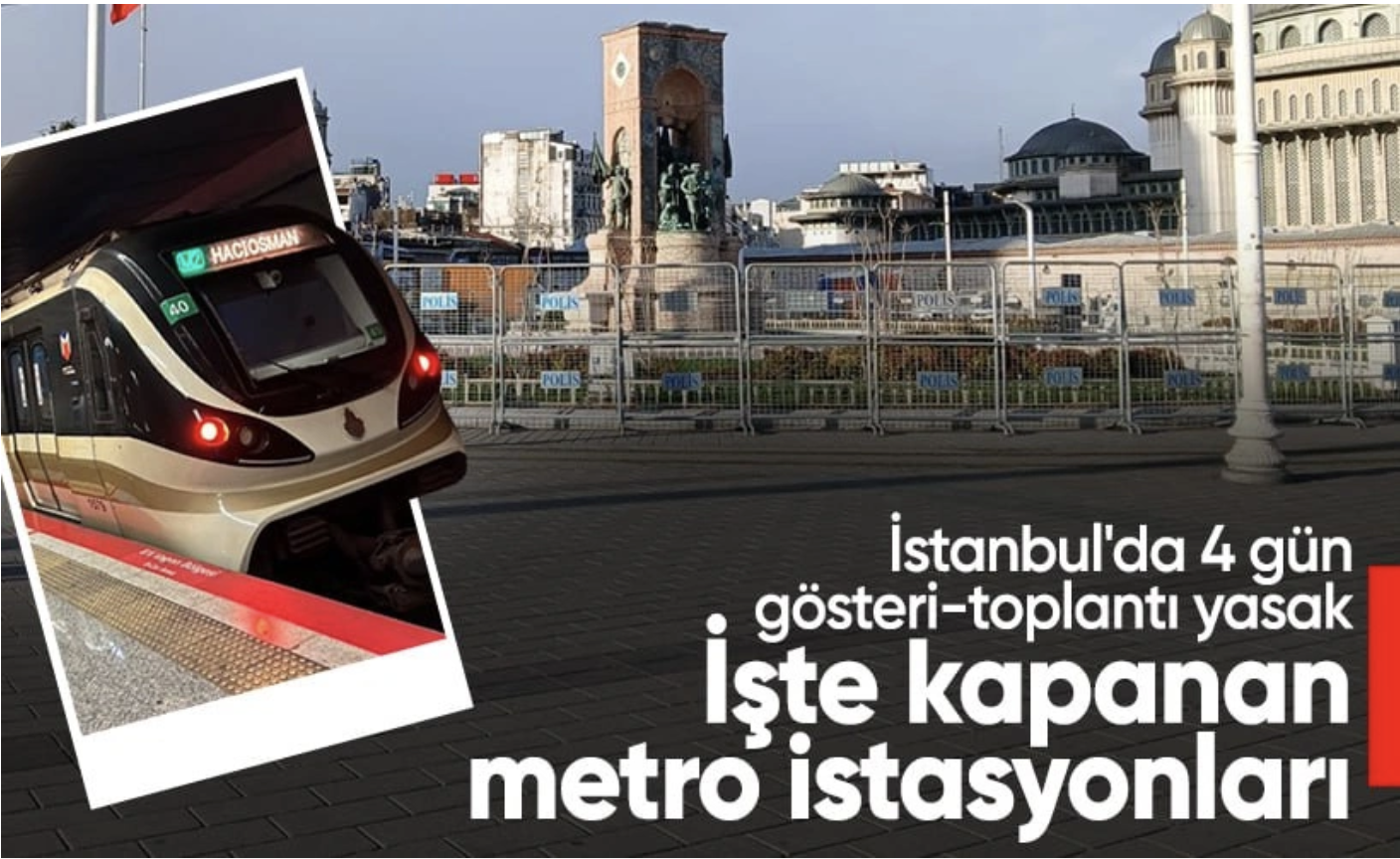 - 19 Mart 2025 günü saat 06.00’dan itibaren; İstanbul Büyükşehir Belediyesi Metro A.Ş. tarafından işletilen- M1A Yenikapı- Atatürk Havalimanı ve M1B Yenikapı-Kirazlı metro hatlarının Emniyet-Fatih İstasyonunun iptal edilerek (tüm yolcu giriş ve çıkış noktaları dahil) sefere kapatılması,