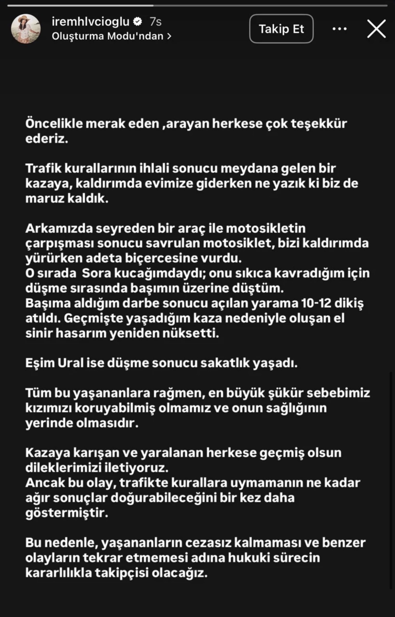 Kazadan hemen sonra, İrem Helvacıoğlu sosyal medya hesabından paylaştığı etkileyici mesajla hayranlarını rahatlattı. “Öncelikle merak eden, arayan herkese çok teşekkür ederiz. Trafik kurallarının ihlali sonucu meydana gelen bir kazaya, kaldırımda evimize giderken ne yazık ki biz de maruz kaldık. Arkamızda seyreden bir araç ile motosikletin çarpışması sonucu savrulan motosiklet, bizi kaldırımda yürürken adeta biçercesine vurdu. O sırada Sora kucağımdaydı. Onu sıkıca kavradığım için düşme sırasında başımın üzerine düştüm. Başıma aldığım darbe sonucu açılan yarama 10-12 dikiş atıldı. Geçmişte yaşadığım kaza nedeniyle oluşan el sinir hasarım yeniden nüksetti. Eşim Ural Kaspar ise düşme sonucu sakatlık yaşadı. Tüm bu yaşananlara rağmen, en büyük şükür sebebimiz kızımızı koruyabilmiş olmamız ve onun sağlığının yerinde olmasıdır. Kazaya karışan ve yaralanan herkese geçmiş olsun dileklerimizi iletiyoruz. Ancak bu olay, trafikte kurallara uymamanın ne kadar ağır sonuçlar doğurabileceğini bir kez daha göstermiştir. Bu nedenle, yaşananların cezasız kalmaması ve benzer olayların tekrar etmemesi adına hukuki sürecin kararlılıkla takipçisi olacağız” dedi.