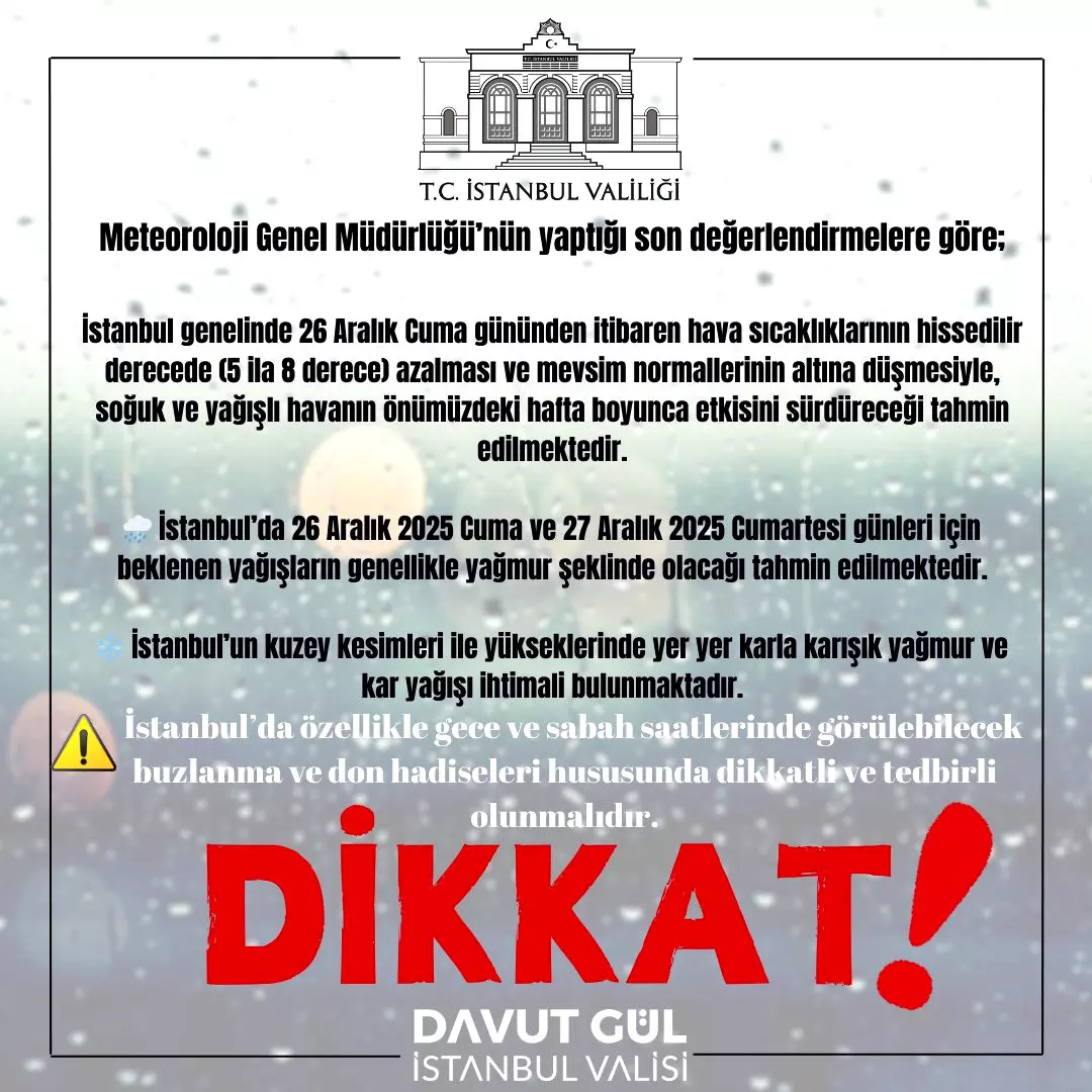Valilikten yapılan açıklamaya göre, 26 Aralık Cuma gününden itibaren İstanbul genelinde hava sıcaklıklarında 5 ila 8 derece arasında düşüş yaşanacak. Soğuk ve yağışlı havanın önümüzdeki hafta boyunca etkisini sürdürmesi tahmin ediliyor.