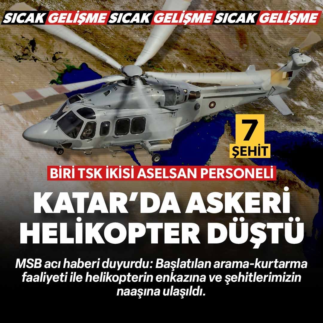 Kazada ayrıca Katar Silahlı Kuvvetleri’nden 4 personel de şehit düştü. Helikopterin teknik arıza nedeniyle denize düştüğü belirtilirken, arama kurtarma çalışmaları sonucu enkaz ve şehit naaşlarına ulaşıldı. Kaza kırım incelemesi Katar makamlarınca devam ediyor.