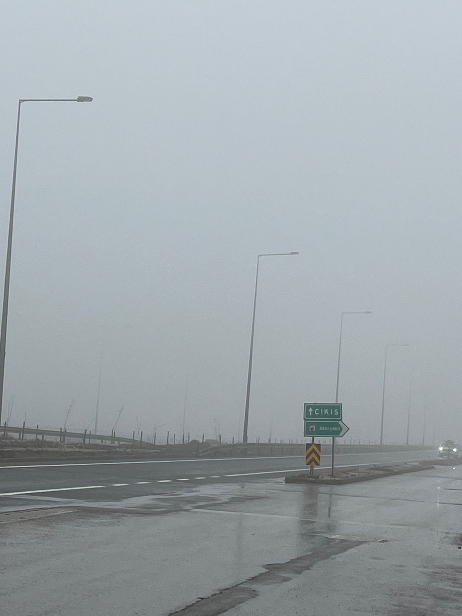 Yağışla birlikte ağırlaşan hava koşulları, otoyolda adeta gri bir perde oluştururken, araçların ilerleyişi neredeyse “görmeden sürüş” noktasına geldi. Yol kenarındaki aydınlatma direkleri ve yön tabelaları sisin içinde siluet halinde kaybolurken, sürücüler düşük hızda ve sis lambalarıyla ilerlemek zorunda kaldı.