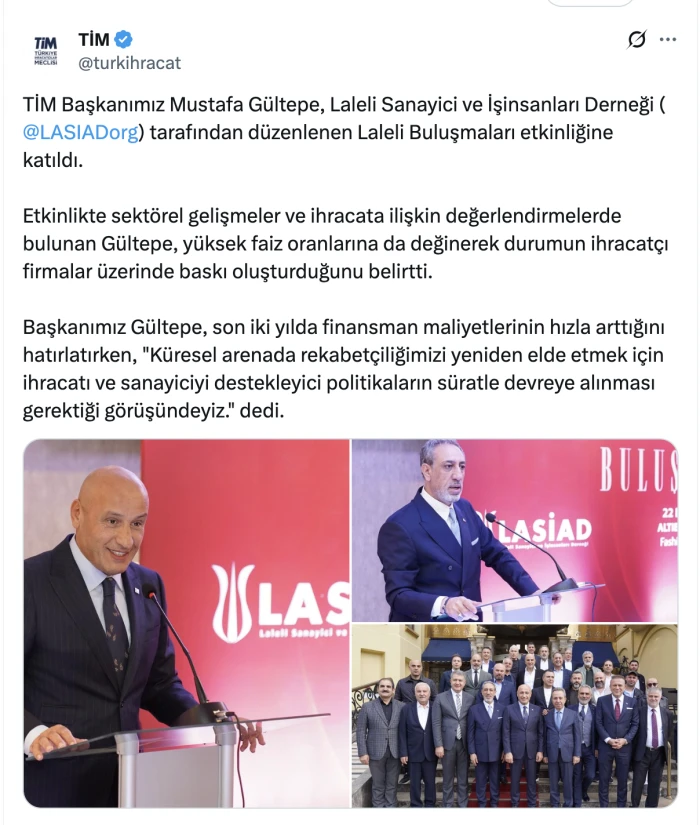 TİM Başkanı Mustafa Gültepe, Laleli Sanayici ve İşinsanları Derneği tarafından düzenlenen Laleli Buluşmaları etkinliğine katıldı. Etkinlikte sektörel gelişmeler ve ihracata ilişkin değerlendirmelerde bulunan Gültepe, yüksek faiz oranlarına da değinerek durumun ihracatçı firmalar üzerinde baskı oluşturduğunu belirtti. Başkanımız Gültepe, son iki yılda finansman maliyetlerinin hızla arttığını hatırlatırken, "Küresel arenada rekabetçiliğimizi yeniden elde etmek için ihracatı ve sanayiciyi destekleyici politikaların süratle devreye alınması gerektiği görüşündeyiz." dedi.