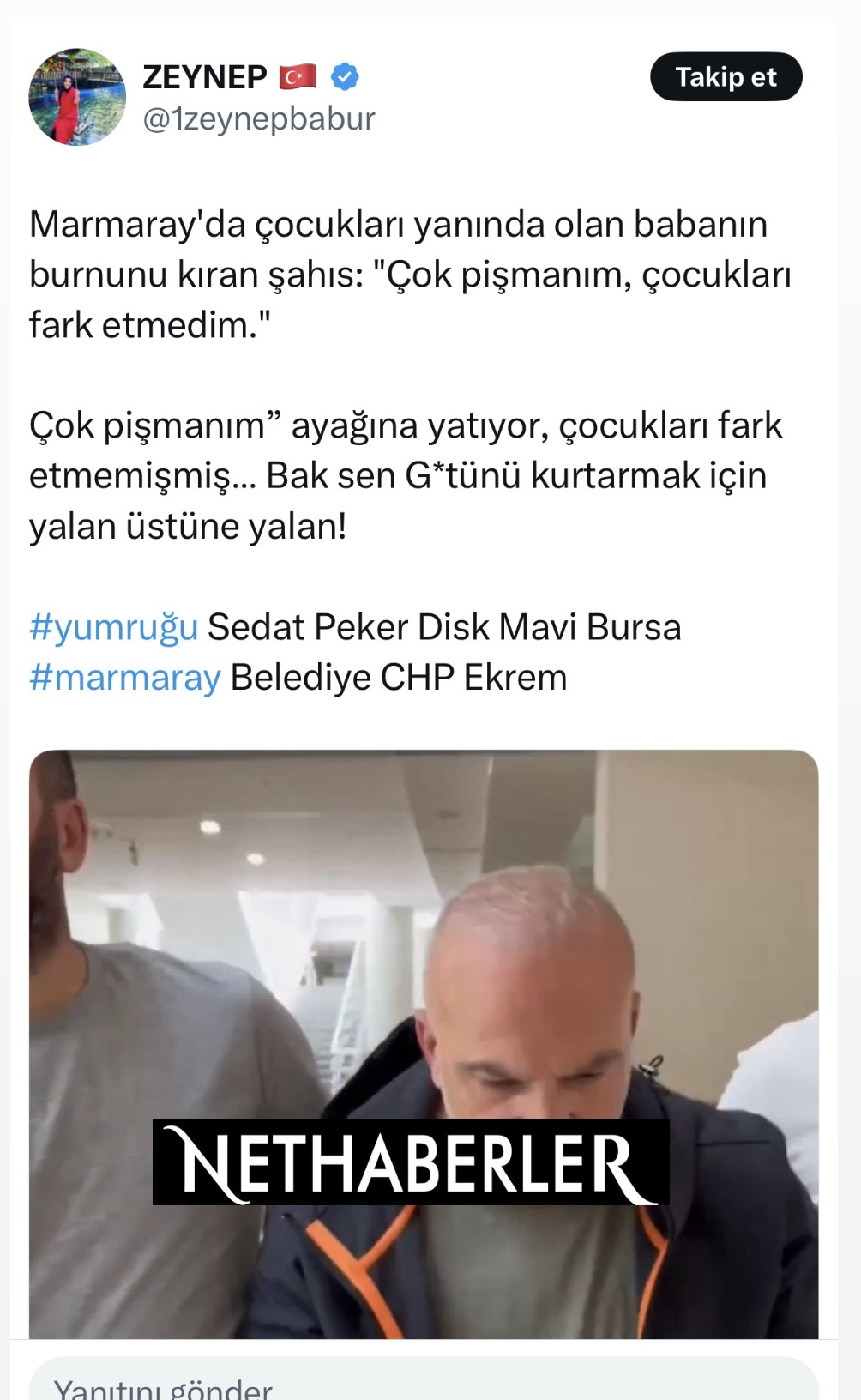 İstanbul Marmaray'da iki çocuğuyla yolculuk yapan baba D.E., yer verme meselesi nedeniyle bir kadınla tartıştığı sırada başka iki erkek yolcunun yumruklu saldırısına uğradı. Burnu kırılan D.E. iki çocuğuyla Yalı Mahallesi Süreyyapaşa Tren İstasyonu'nda indi. "Kasten yaralama" suçundan işlem başlatıldı.Olayın yankıları sürerken Sedat Peker'in de yapılan bir paylaşımı retweet etmesi dikkat çekti.Sedat Peker'in retwetlediği paylaşımda şu ifadeler yer aldı: "İstanbul Maltepe'de, Marmaray'da kız çocuğunun yanında bir babaya atılan yumruk sonrası, Sedat Peker'in şu sözü yeniden gündeme geldi: Erkek çocuklarıma eziyet etseler derim ki; hayat onları sertleştiriyor. Ama kızlarıma olmaz… Görüşeceğiz."