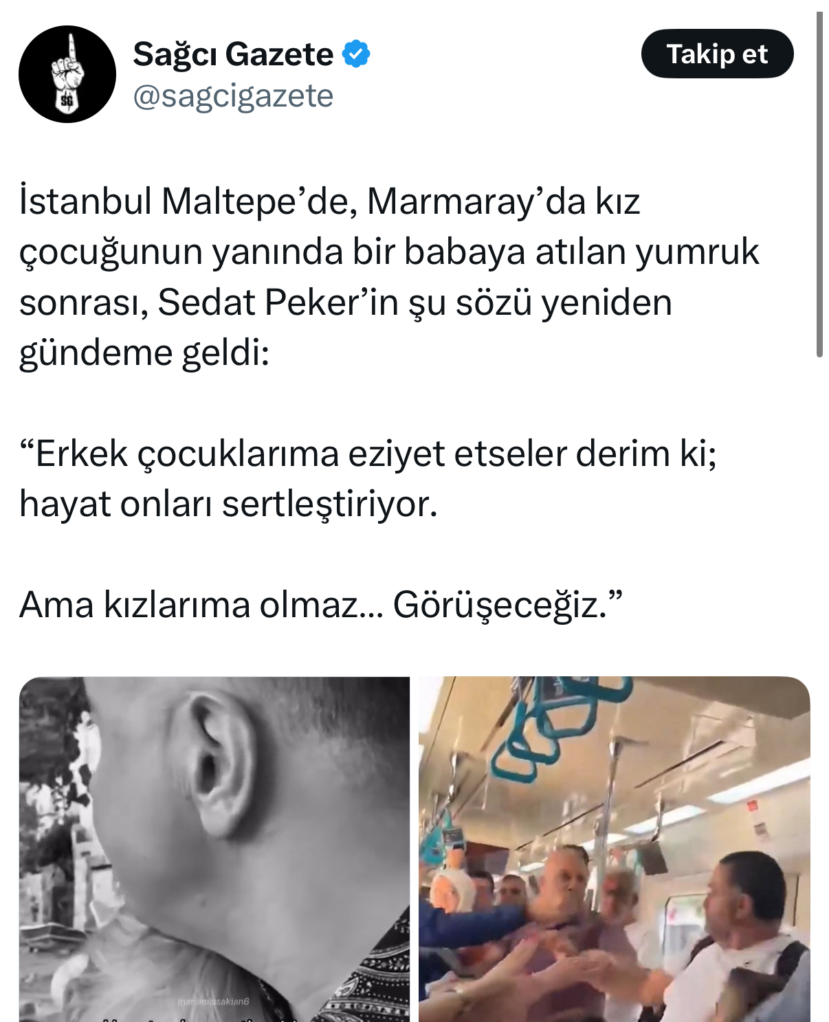 İstanbul Maltepe’de, Marmaray’da kız çocuğunun yanında bir babaya atılan yumruk sonrası, Sedat Peker’in şu sözü yeniden gündeme geldi: