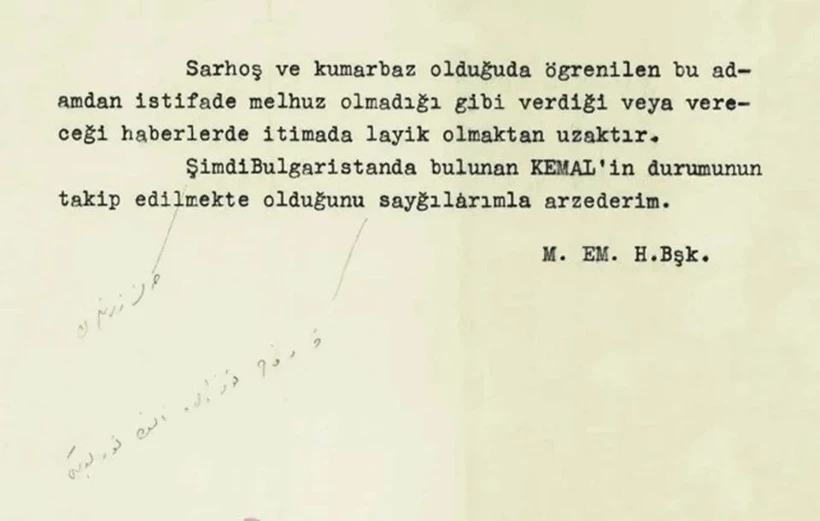 - Sarhoş ve kumarbaz olduğu da öğrenilen bu adamdan istifade melhuz olmadığı gibi verdiği veya vereceği haberler de itimada layık olmaktan uzaktır. Şimdi Bulgaristan'da bulunan Kemal'in durumunun takip edilmekte olduğunu saygılarımla arz ederim."