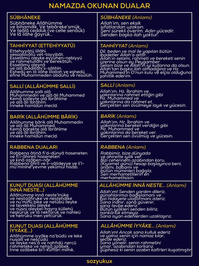 Namazda okunan dualar (prayers in salah), her bir rekat ve hareketle uyum içinde okunuyor. İşte en çok bilinenlerden bazıları: