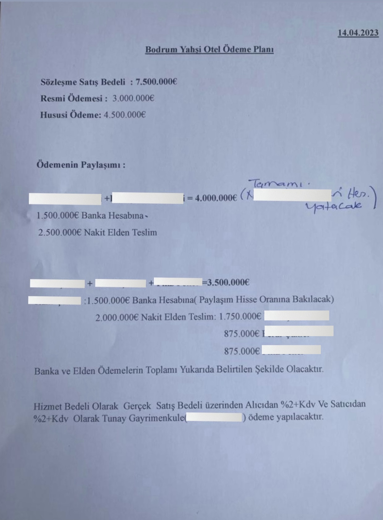 Bodrum’un incisi Yahşi’de, begonvillerle çevrili denize sıfır bir cennette başlayan bu hikaye, adeta bir gerilim filmi gibi. İlk bakışta sıradan bir otel satışı gibi görünen işlem, belgelerin derinliklerinde bambaşka bir yüz kazanıyor. NetHaberler’e ulaşan “Bodrum Yahşi Ömer Aybak Otel Ödeme Planı” adlı belge, adeta bir kara para aklama senaryosunu andırıyor. Sözleşme satış bedeli olarak belirtilen 7.500.000€ (yaklaşık 370 milyon Türk Lirası) rakamı, resmi kayıtlara yansımayan 4.500.000€’luk “hususi ödeme” ile gölgeleniyor. Resmi ödeme ise sadece 3.000.000€ olarak sınırlı tutulmuş. Yani bu yöntemle ortalama 220 milyon Türk Lirası satıştan gizlenerek devlet, milyonlarca lira zarara uğramış.