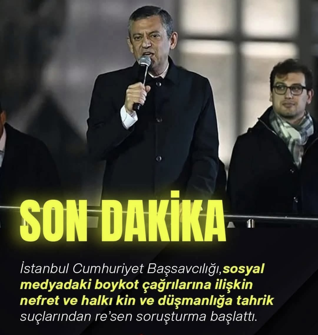 CHP lideri Özgür Özel'in fitilini ateşlemesi sonrası sosyal medyada da yayılan korsan boykot çağrılarına yönelik İstanbul Cumhuriyet Başsavcılığı harekete geçti. Başsavcılıktan yapılan açıklamada, geleneksel ve sosyal medyada yer alan ekonomik boykot çağrılarına ilişkin olarak 'Nefret ve Ayrımcılık' ile 'Halkı Kin ve Düşmanlığa Tahrik' suçlarından resen soruşturma başlatıldığı belirtildi.