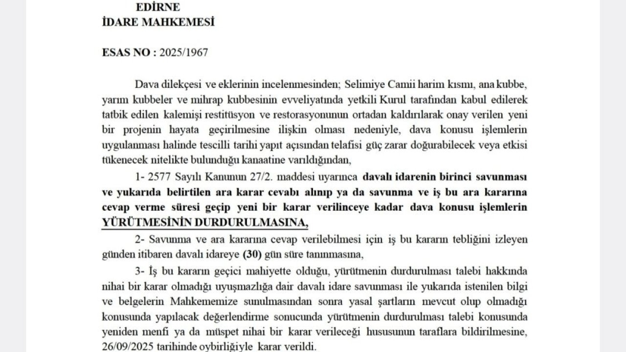Edirne İdare Mahkemesi, 27 Eylül 2025 tarihli oturumda, yürütmeyi durdurdu – gerekçe, "tarihi yapının özgünlüğünü bozma riski". Mahkeme, değişikliklerin önceki restorasyonları geçersiz kılabileceğini, telafisi güç zararlar doğurabileceğini belirtti. Bakanlığa verilen 30 günlük süre, projenin teknik dayanaklarını, itiraz yanıtlarını ve belgeleri kapsıyor. Bu karar, Cumhuriyet Gazetesi'nde "Tepki çeken restorasyona mahkemeden dur" diye manşetlendi. Hürriyet ise "Selimiye'de restorasyona durdurma" başlığıyla, ulusal çapta yayılmasını sağladı.