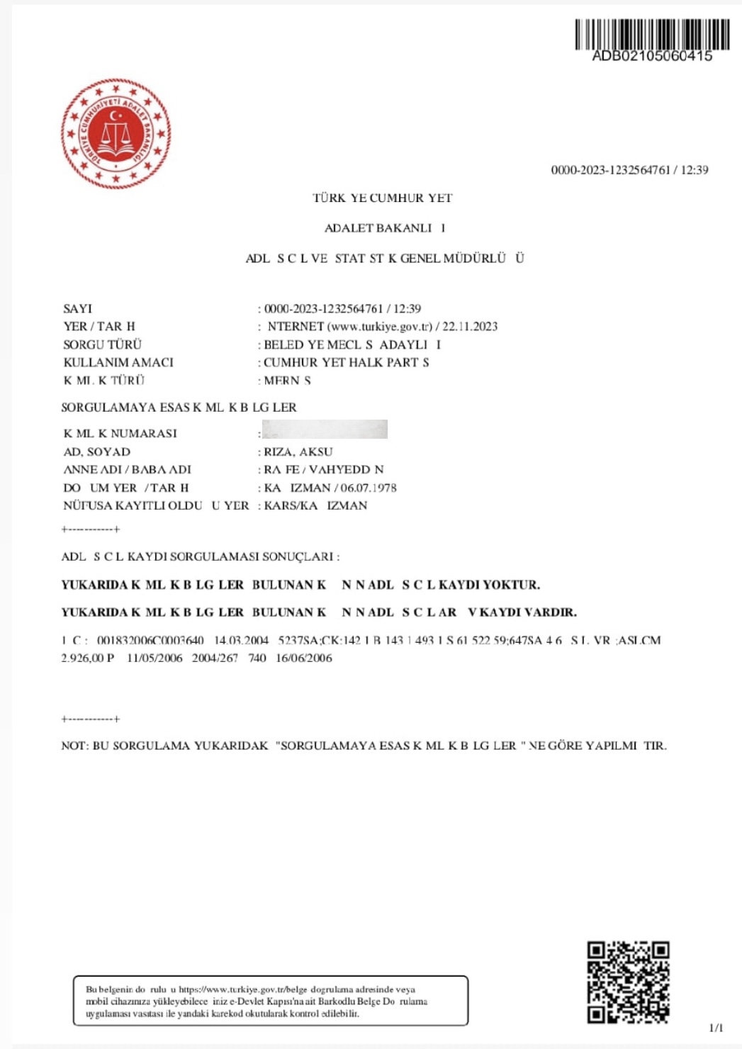 İHBARLA GELEN; RIZA AKSU'NUN MECLİS ÜYESİ OLABİLMEK İÇİN SABIKA KAYDINI FOTOSHOP İLE SİLEREK 'SABIKA KAYDI YOKTUR' İBARESİ BULUNAN VE DEVLET KURUMLARINA SUNDUĞU ADLİ SİCİL KAYDI BELGESİ;