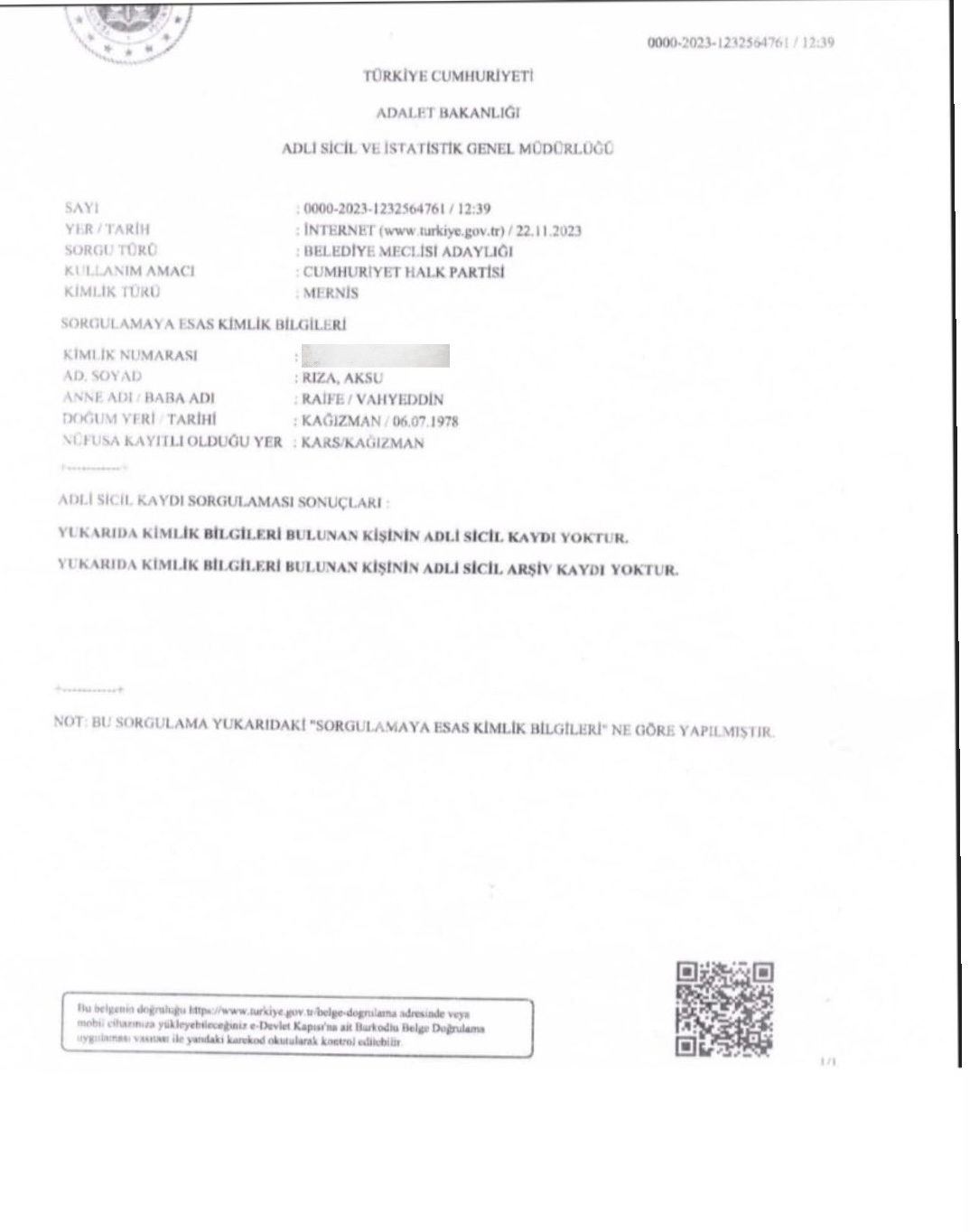 İHBARLA GELEN; RIZA AKSU'NUN MECLİS ÜYESİ OLABİLMEK İÇİN SABIKA KAYDINI FOTOSHOP İLE SİLEREK 'SABIKA KAYDI YOKTUR' İBARESİ BULUNAN VE DEVLET KURUMLARINA SUNDUĞU ADLİ SİCİL KAYDI BELGESİ;
