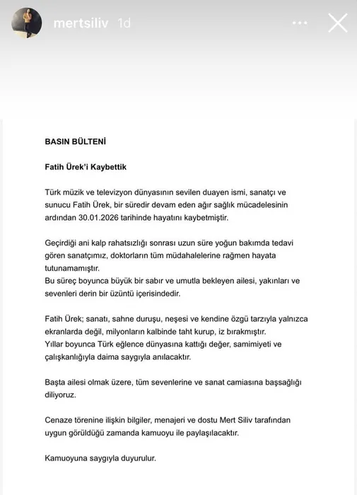 “Türk müzik ve televizyon dünyasının sevilen duayen ismi, sanatçı ve sunucu Fatih Ürek, bir süredir devam eden ağır sağlık mücadelesinin ardından 30.01.2026 tarihinde hayatını kaybetmiştir.”