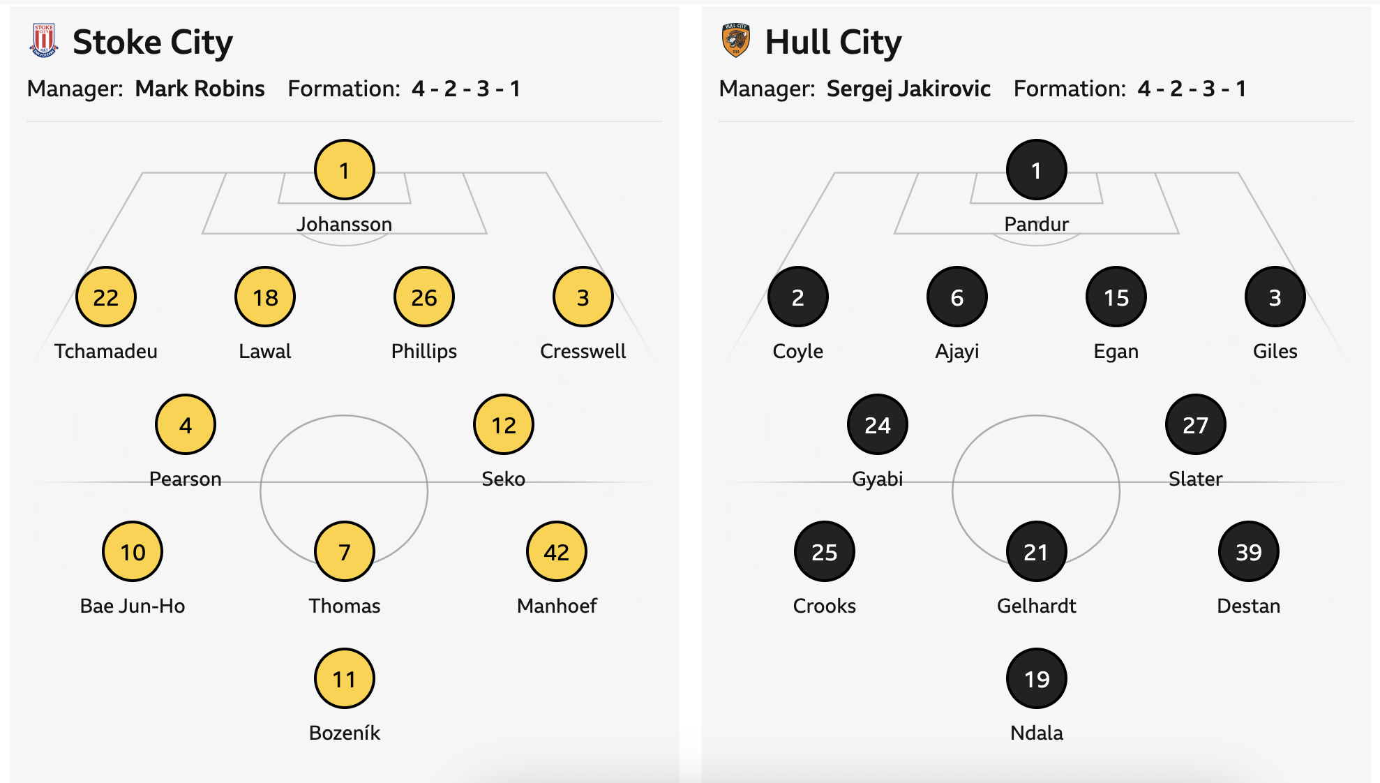 Sakatlıklar, maçın kaderini belirleyebilir – özellikle Hull cephesinde fırtına kopuyor. Stoke City'de kaptan Ben Wilmot antrenmanlara döndü ve forma giyebilecek gibi. Lewis Baker hâlâ ayak bileği sakatlığıyla dışarıda, ama Bosun Lawal hamstring'den sonra tam hazır. Forvette Sorba Thomas parlıyor: Son 5 iç saha maçında 4 gol! Million Manhoef'in 4 gollü performansı da cabası. Muhtemel 11: Johansson; Tchamadeu, Wilmot, Phillips, Bocat; Seko, Nzonzi, Manhoef; Jun-ho, Thomas, Bozenik.