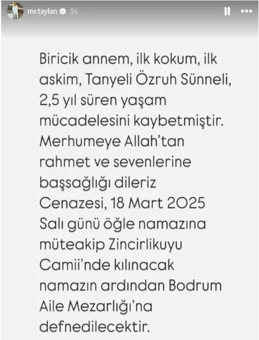 "Biricik annem, ilk kokum, ilk aşkım, Tanyeli Özruh Sünneli, 2.5 yıl süren yaşam mücadelesini kaybetmiştir. Merhumeye Allah'tan rahmet ve sevenlerine başsağlığı dileriz."
