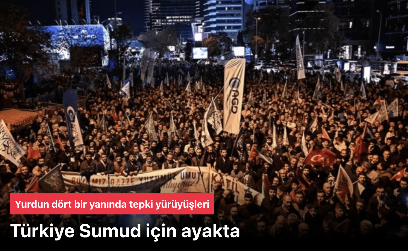 Türkiye'nin dört bir yanında, sumud (sumud) ruhuyla yoğrulmuş bir dayanışma dalgası yükseldi. İsrail'in (Israel) uluslararası sularda Küresel Sumud Filosu'na yönelik müdahalesi, sadece bir deniz olayı değil, insanlık vicdanını sarsan bir kırılma noktasıydı. 1 Ekim 2025 gecesi başlayan bu müdahale, Gazze'ye yardım (aid) taşıyan 50'den fazla gemiyi ve 500'e yakın aktivisti hedef aldı. Aralarında 28 Türk vatandaşının da bulunduğu ekip, sembolik yardım yükleriyle –gıda, ilaç ve bebek maması gibi– ablukayı delmeye çalışıyordu. Ama İsrail donanmasının baskınları, gemileri durdurdu, aktivistleri gözaltına aldı ve dünya kamuoyunu ayağa kaldırdı.
