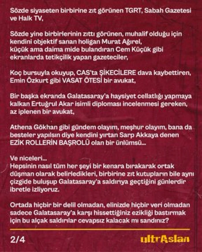 Ortada hiçbir bir delil olmadan, elinizde hiçbir veri olmadan sadece Galatasaray'a karşı hissettiğiniz ezikliği bastırmak için bu alçak saldırılar cevapsız kalacak mı sandınız?