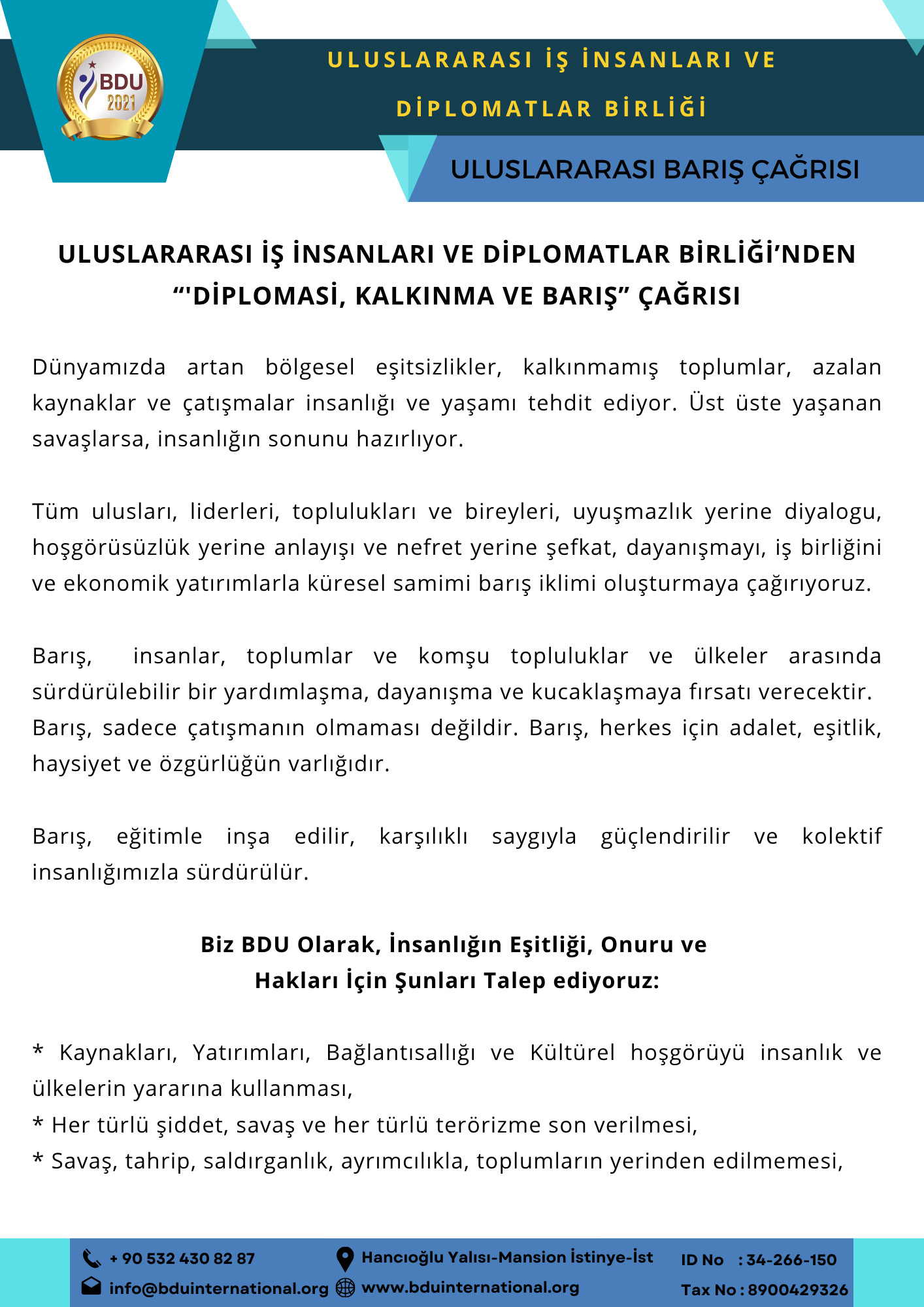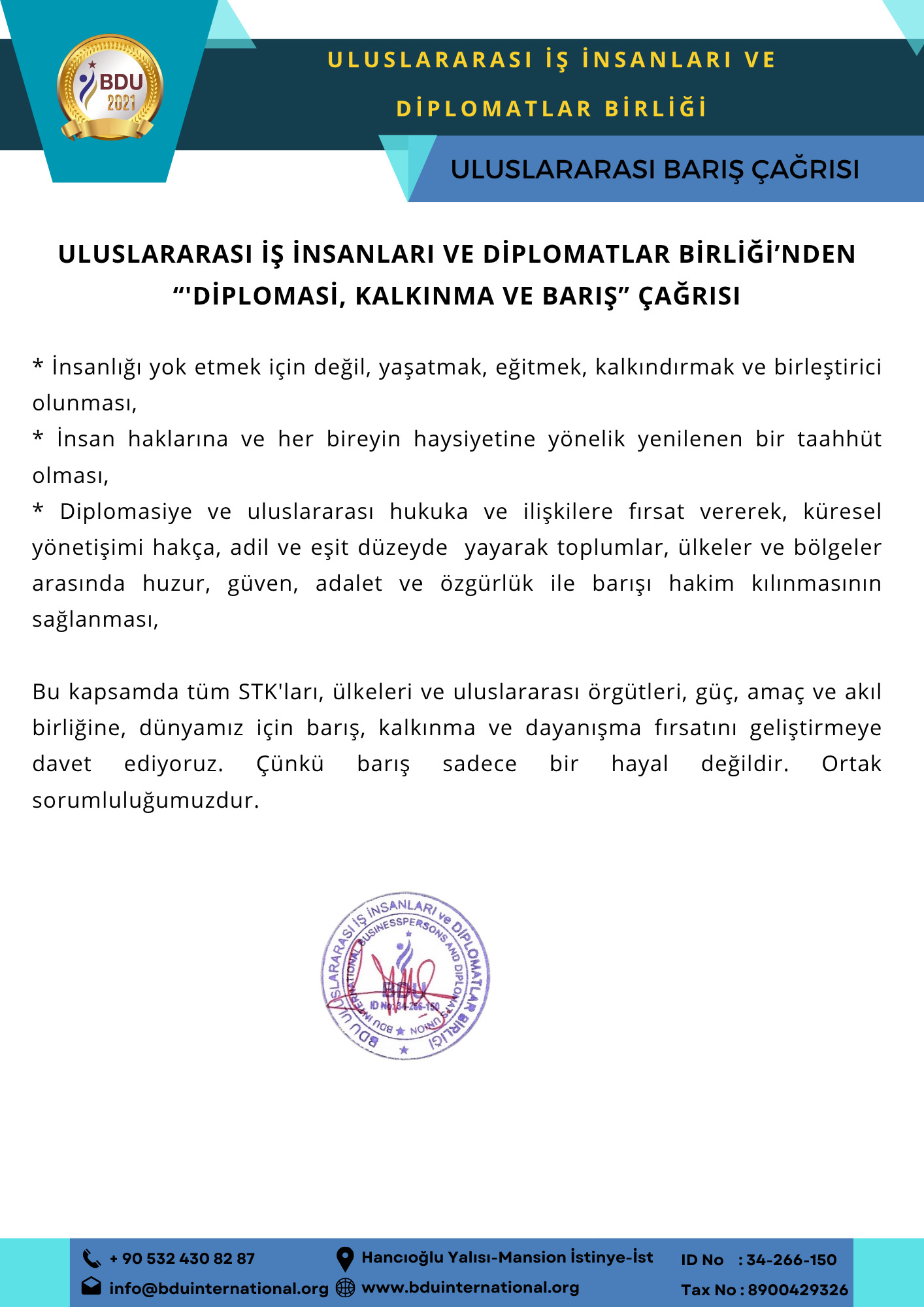 Küresel iklim değişikliği, göç, terörizm, açlık, yoksulluk, silahlanma ve daha pek çok sorun, dünyayı tehdit ederken, savaşın ve yıkımın geriye dönülmez tahribatı karşısında, zamanın sıfırlanması an meselesidir diyen Uluslararası İş İnsanları ve Diplomatlar Birliği, Uluslararası Çağrı Yaparak, Herkesi Barış ve Diplomasiye Davet Etti.