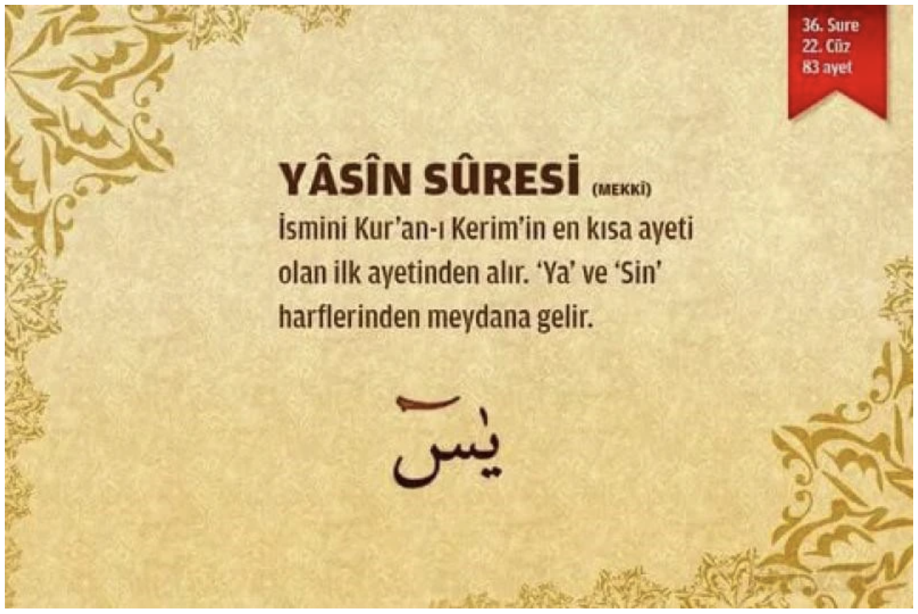 YASİN SURESİ OKUNUŞU, Yasin Suresi (Yasin-i Şerif) Duası Arapça Oku, Türkçe Anlamı ve Kuran Meali Yasin Suresi, Kur'an-ı Kerim'in kalbi olarak nitelendirilir. 83 ayetten oluşmuş ve adını ilk ayetinden almıştır.